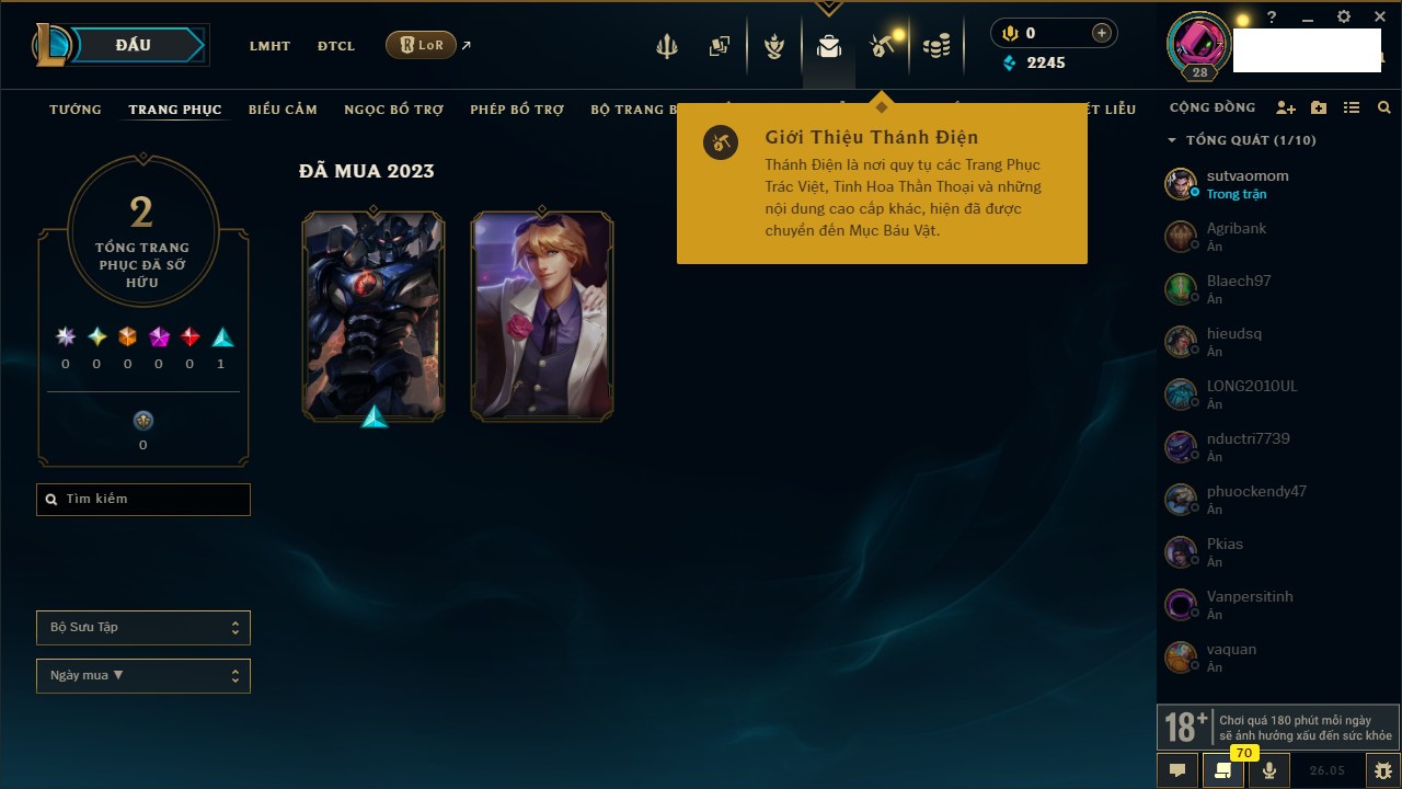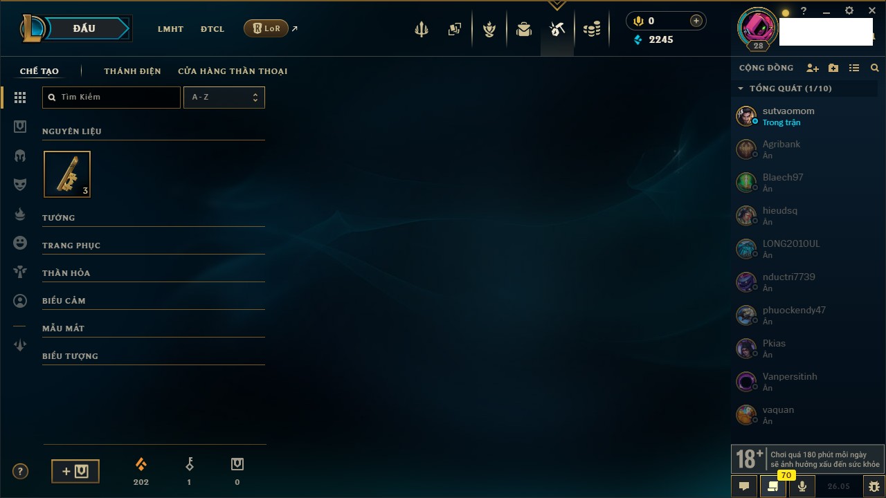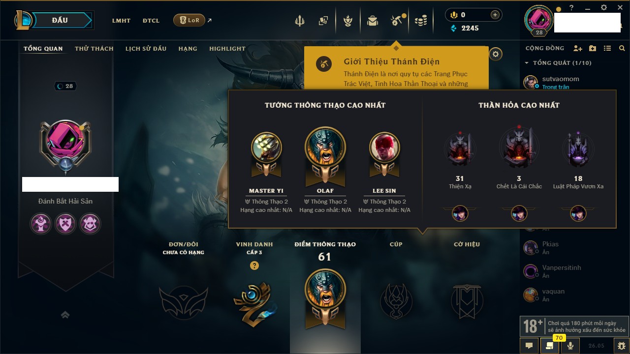 Rank Đơn: Chưa rank mùa nàoKhung: Chưa có khungTướng: 35 - Còn 2245 THXTrang Phục: 2Rank ĐTCL: Chưa RankLinh Thú: 11