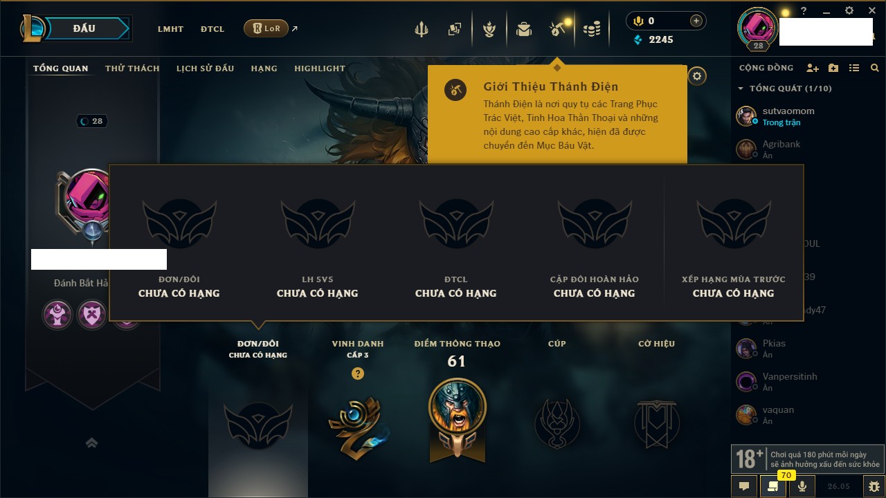 Rank Đơn: Chưa rank mùa nàoKhung: Chưa có khungTướng: 66 - Còn 2350 THXTrang Phục: 0Rank ĐTCL: Chưa RankLinh Thú: 13