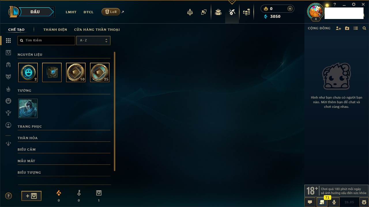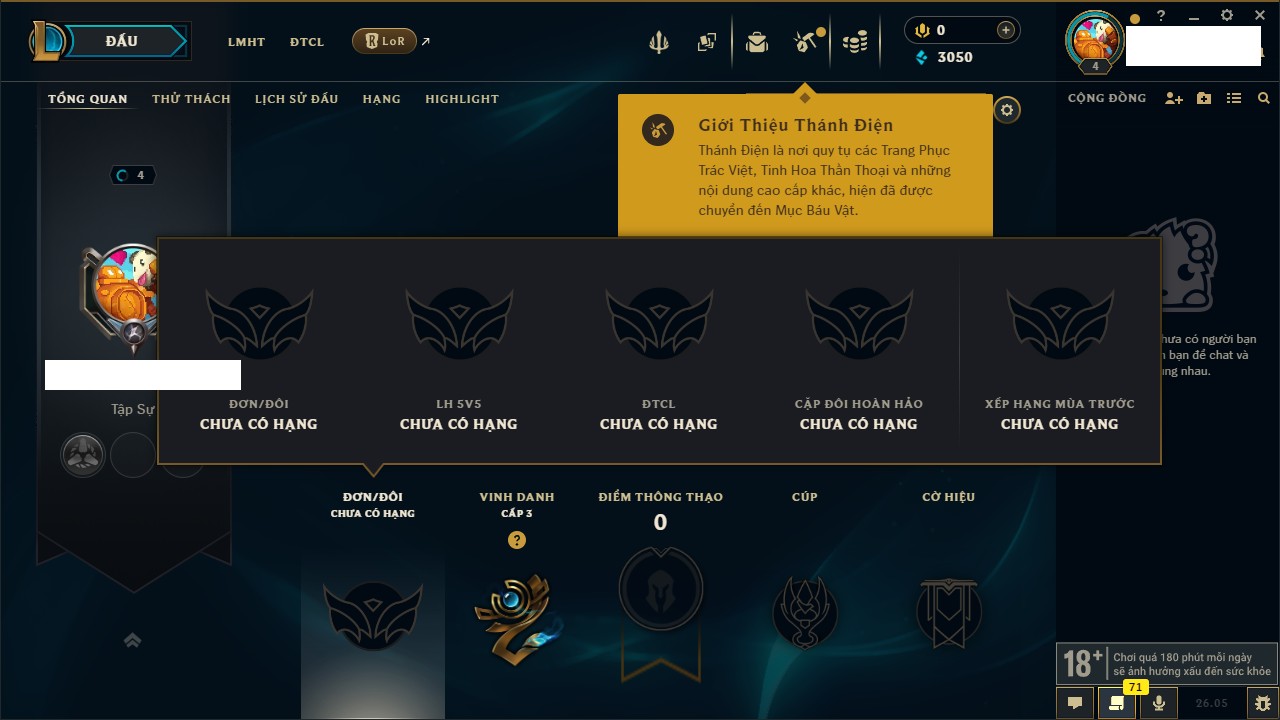 Rank Đơn: Chưa rank mùa nàoKhung: Chưa có khungTướng: 68 - Còn 3050 THXTrang Phục: 0Rank ĐTCL: Chưa RankLinh Thú: 9