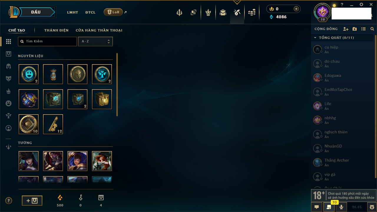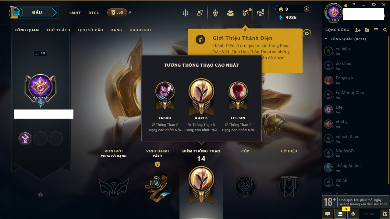 Rank Đơn: Chưa rank mùa nàoKhung: Chưa có khungTướng: 27 - Còn 2900 THXTrang Phục: 4Rank ĐTCL: Chưa RankLinh Thú: 24