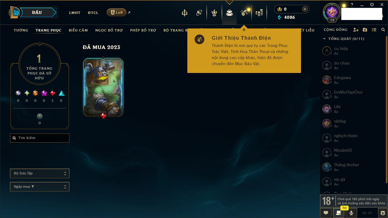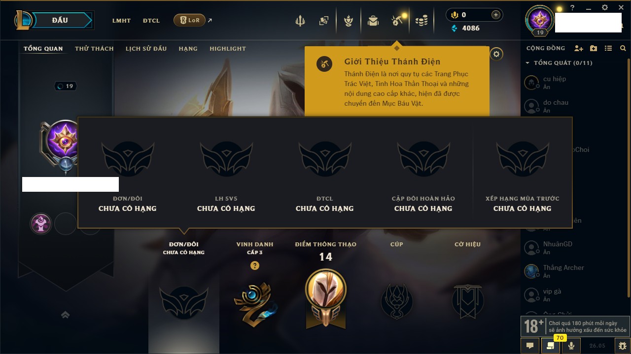 Rank Đơn: Chưa rank mùa nàoKhung: Chưa có khungTướng: 67 - Còn 2499 THXTrang Phục: 0Rank ĐTCL: Chưa RankLinh Thú: 12