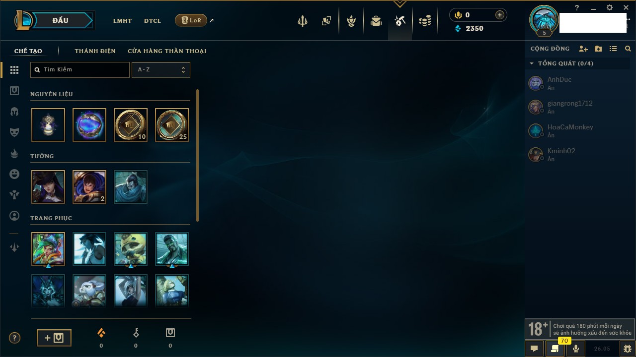 Rank Đơn: Chưa rank mùa nàoKhung: Chưa có khungTướng: 68 - Còn 3050 THXTrang Phục: 0Rank ĐTCL: Chưa RankLinh Thú: 9