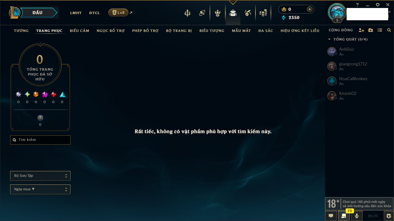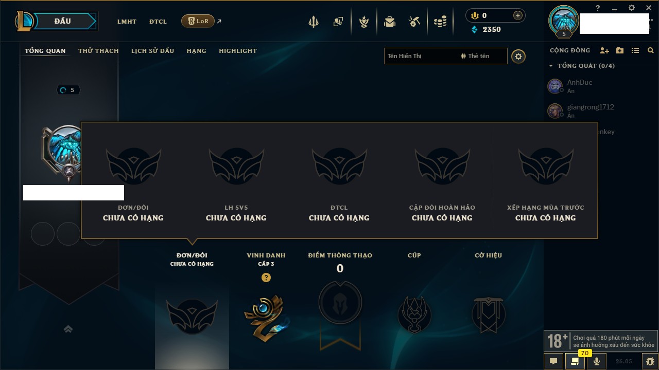 Rank Đơn: Chưa rank mùa nàoKhung: Chưa có khungTướng: 66 - Còn 2350 THXTrang Phục: 0Rank ĐTCL: Chưa RankLinh Thú: 13