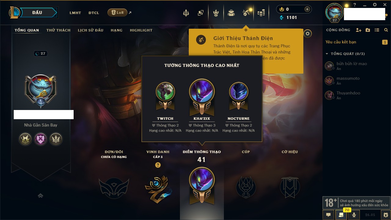 Rank Đơn: Chưa rank mùa nàoKhung: Chưa có khungTướng: 18 - Còn 1098 THXTrang Phục: 3Rank ĐTCL: Chưa RankLinh Thú: 13