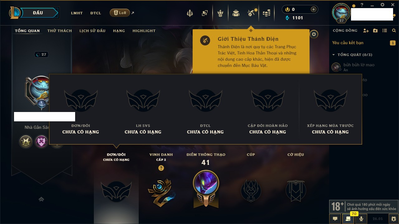 Rank Đơn: Chưa rank mùa nàoKhung: Chưa có khungTướng: 111 - Còn 5125 THXTrang Phục: 0Rank ĐTCL: Chưa RankLinh Thú: 6