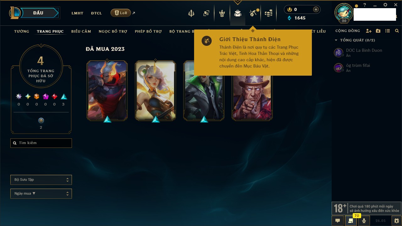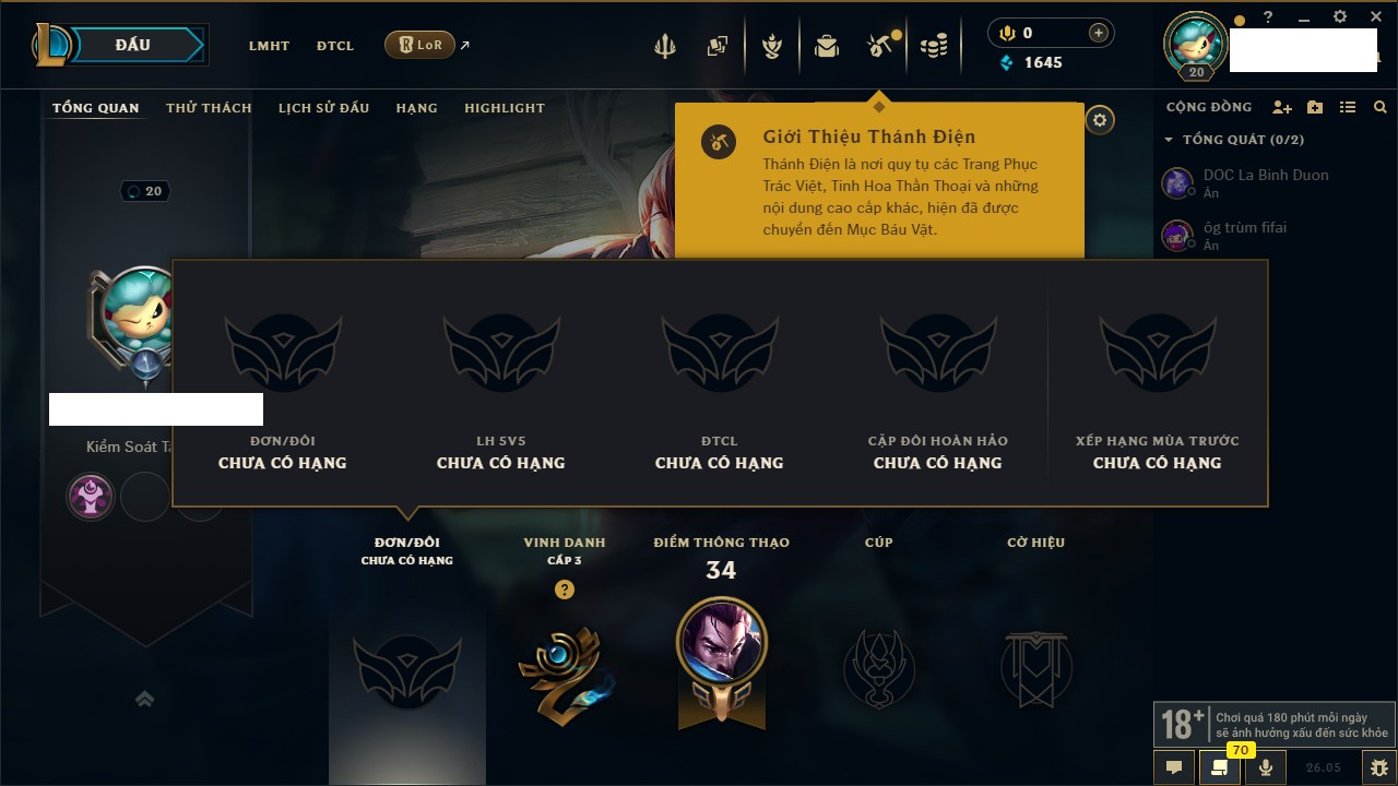 Rank Đơn: Chưa rank mùa nàoKhung: Chưa có khungTướng: 23 - Còn 7504 THXTrang Phục: 6Rank ĐTCL: Chưa RankLinh Thú: 30