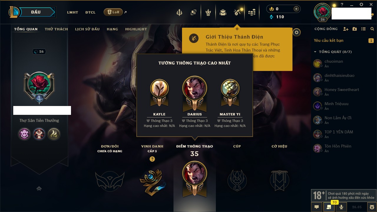 Rank Đơn: Chưa rank mùa nàoKhung: Chưa có khungTướng: 37 - Còn 230 THXTrang Phục: 0Rank ĐTCL: Chưa RankLinh Thú: 8