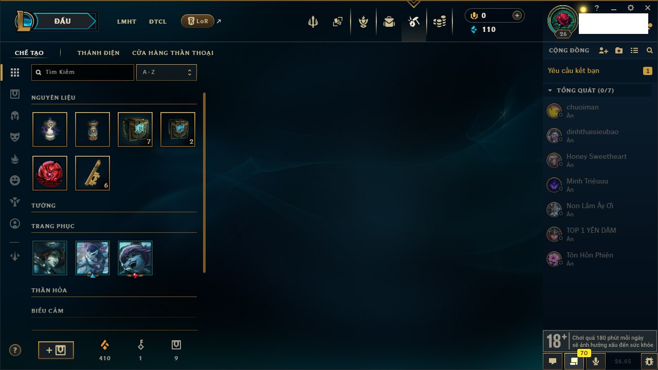 Rank Đơn: Chưa rank mùa nàoKhung: Chưa có khungTướng: 67 - Còn 7200 THXTrang Phục: 0Rank ĐTCL: Chưa RankLinh Thú: 11