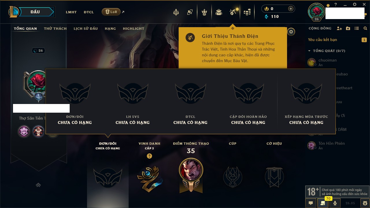 Rank Đơn: Chưa rank mùa nàoKhung: Chưa có khungTướng: 34 - Còn 406 THXTrang Phục: 0Rank ĐTCL: Chưa RankLinh Thú: 4