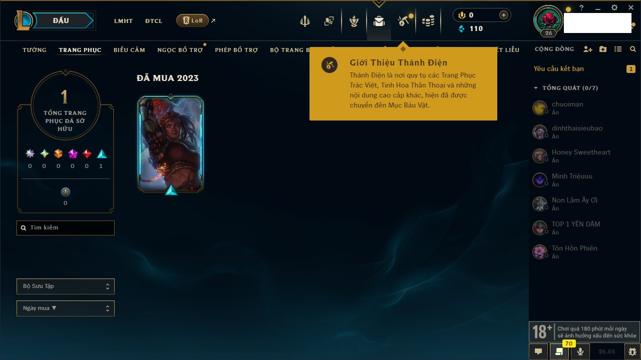 Rank Đơn: Chưa rank mùa nàoKhung: Chưa có khungTướng: 23 - Còn 7450 THXTrang Phục: 4Rank ĐTCL: Chưa RankLinh Thú: 24
