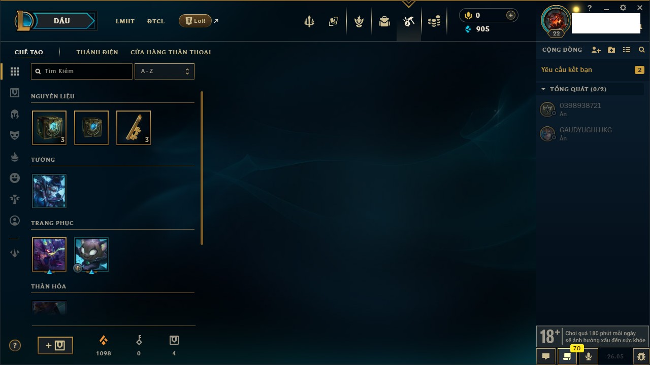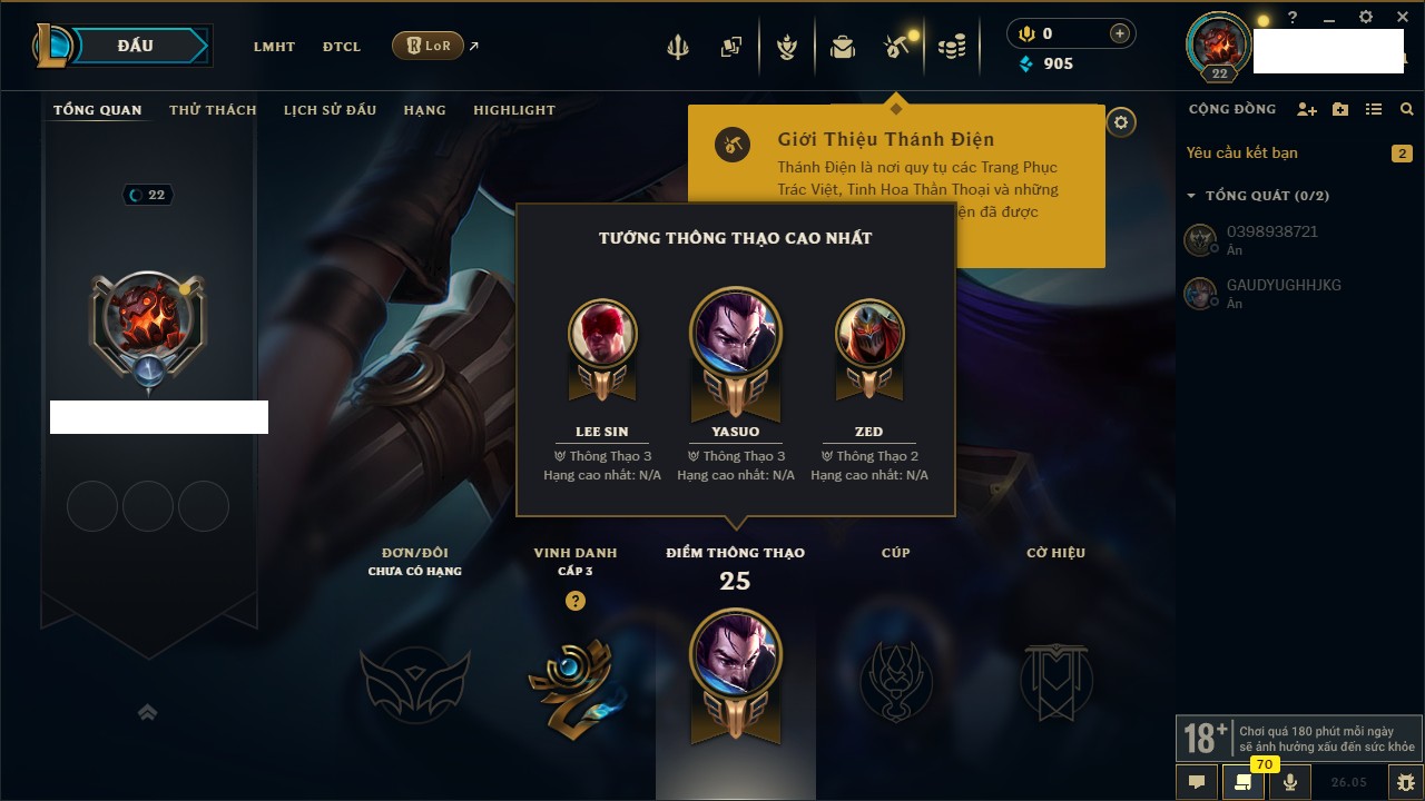 Rank Đơn: Chưa rank mùa nàoKhung: Chưa có khungTướng: 91 - Còn 3400 THXTrang Phục: 0Rank ĐTCL: Chưa RankLinh Thú: 7