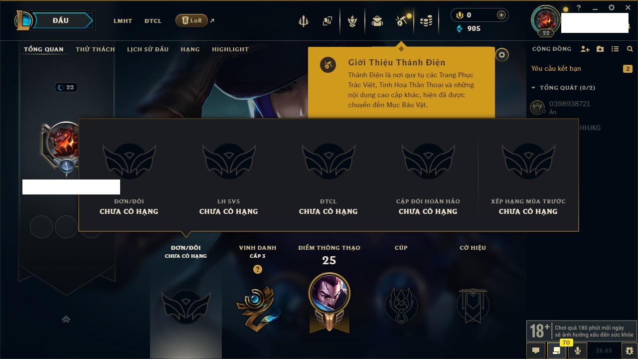 Rank Đơn: Chưa rank mùa nàoKhung: Chưa có khungTướng: 34 - Còn 406 THXTrang Phục: 0Rank ĐTCL: Chưa RankLinh Thú: 4