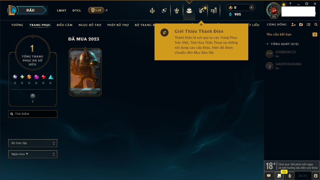 Rank Đơn: Chưa rank mùa nàoKhung: Chưa có khungTướng: 23 - Còn 7450 THXTrang Phục: 4Rank ĐTCL: Chưa RankLinh Thú: 24