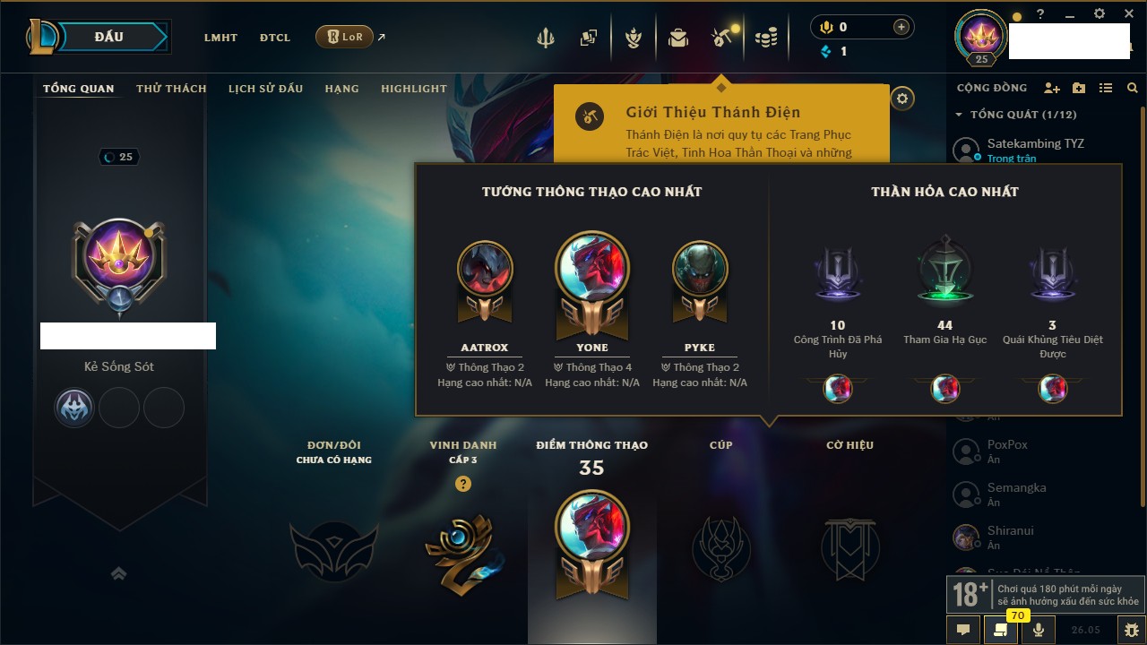 Rank Đơn: Chưa rank mùa nàoKhung: Chưa có khungTướng: 67 - Còn 6000 THXTrang Phục: 0Rank ĐTCL: Chưa RankLinh Thú: 5