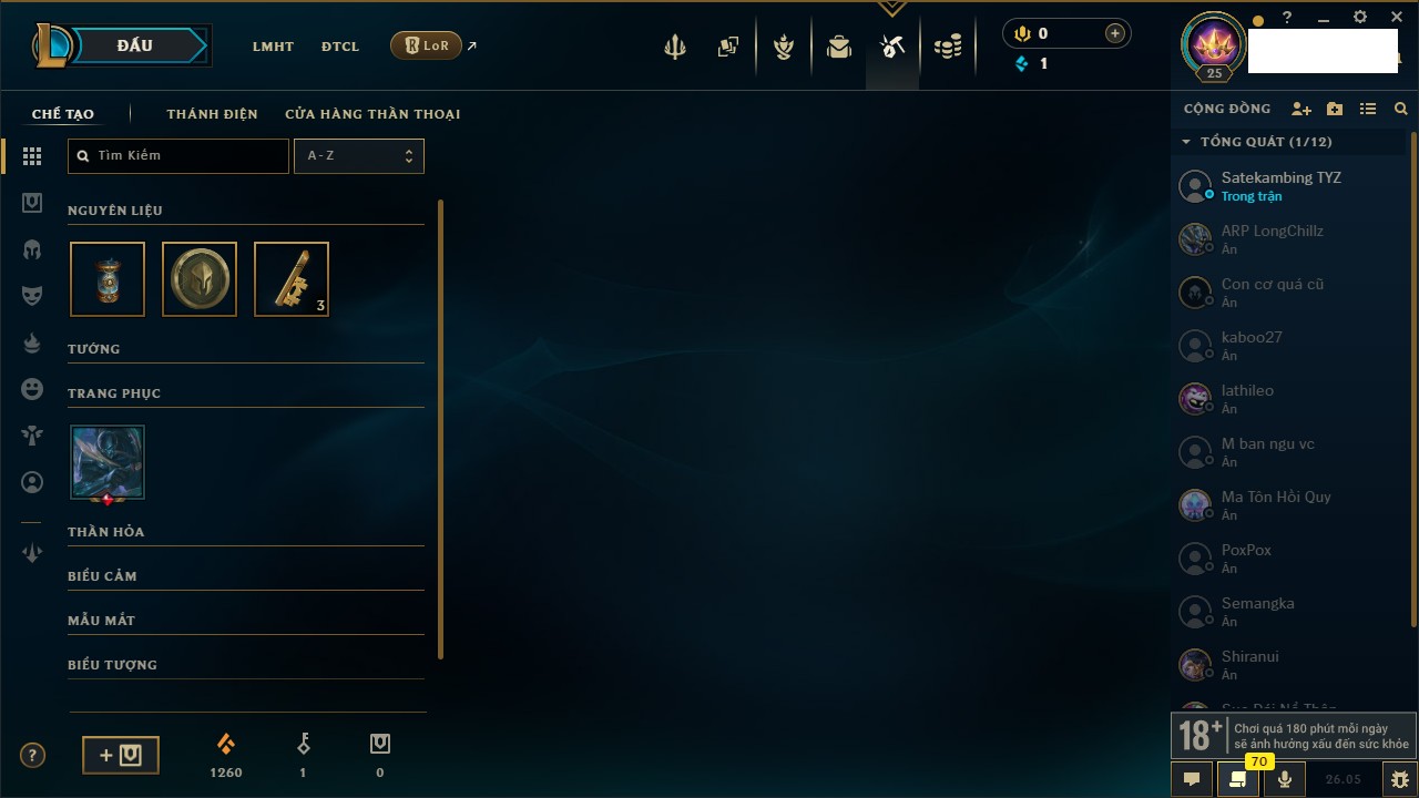 Rank Đơn: Chưa rank mùa nàoKhung: Chưa có khungTướng: 71 - Còn 3600 THXTrang Phục: 0Rank ĐTCL: Chưa RankLinh Thú: 8