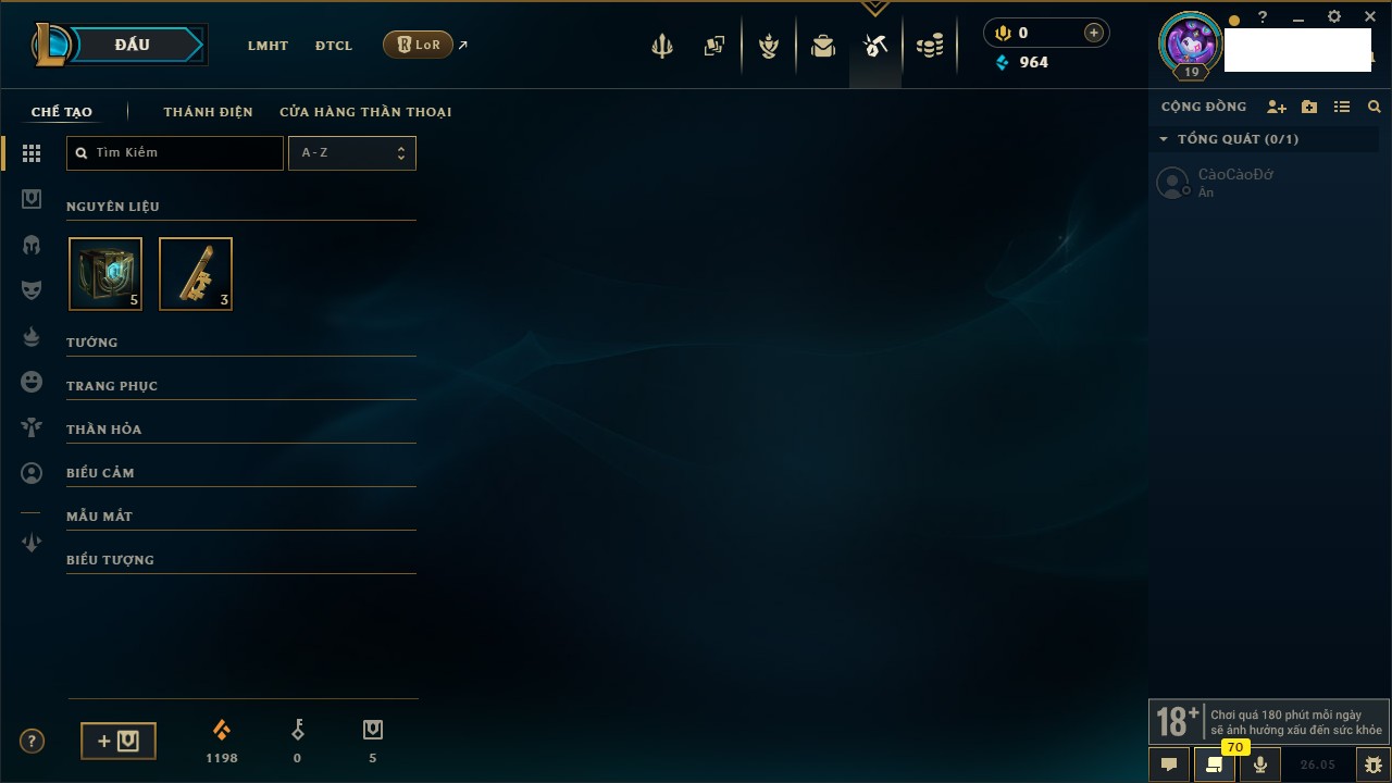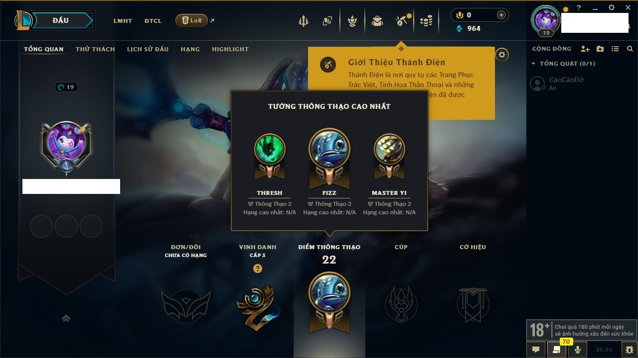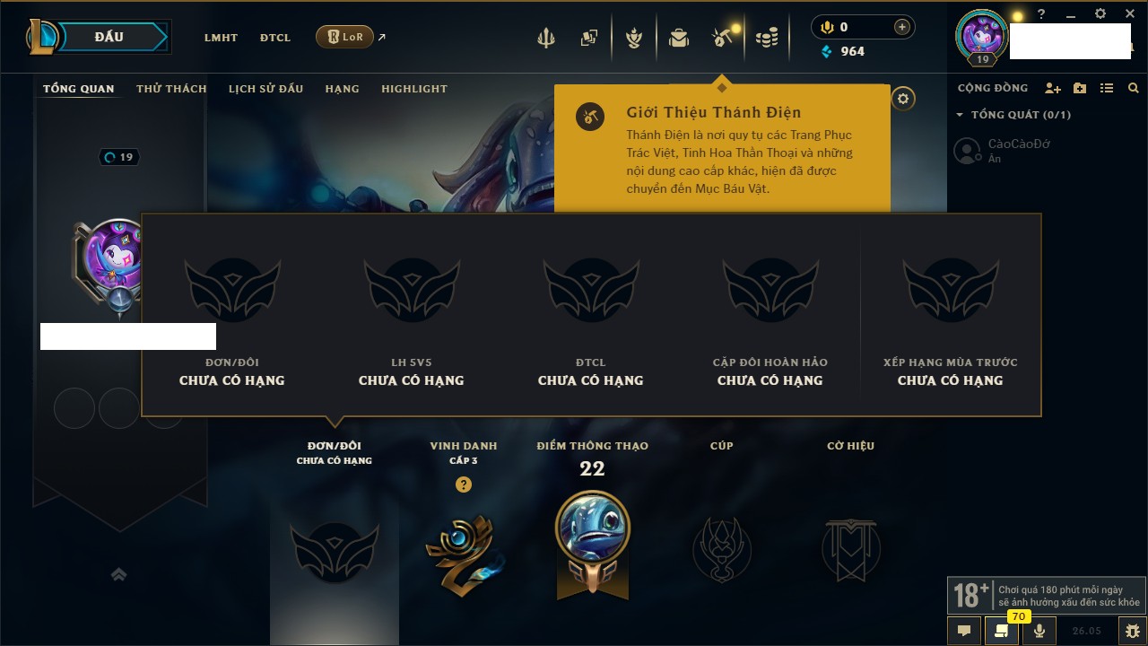 Rank Đơn: Chưa rank mùa nàoKhung: Chưa có khungTướng: 18 - Còn 4790 THXTrang Phục: 3Rank ĐTCL: Chưa RankLinh Thú: 20
