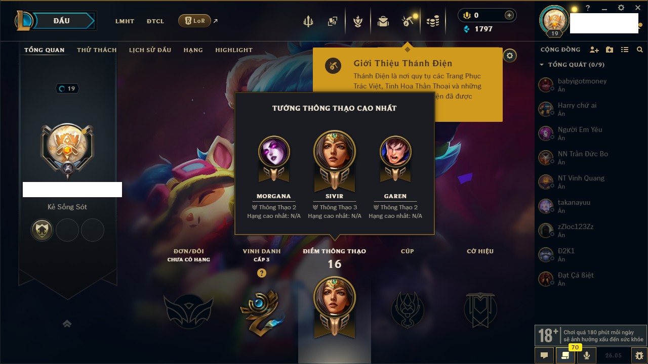 Rank Đơn: Chưa rank mùa nàoKhung: Chưa có khungTướng: 31 - Còn 1797 THXTrang Phục: 6Rank ĐTCL: Chưa RankLinh Thú: 7