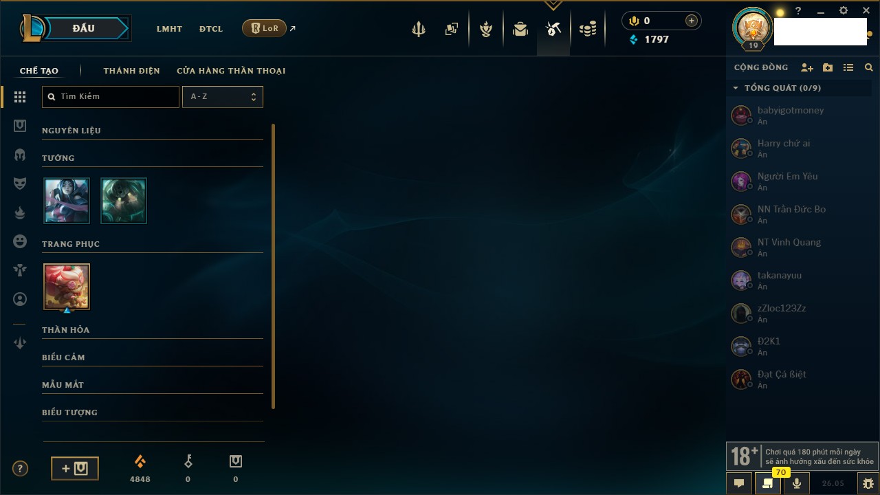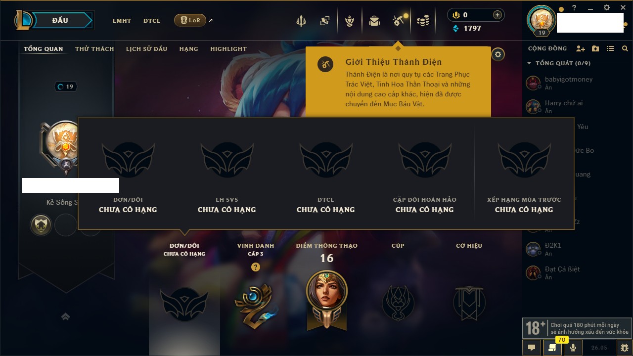 Rank Đơn: Chưa rank mùa nàoKhung: Chưa có khungTướng: 67 - Còn 6000 THXTrang Phục: 0Rank ĐTCL: Chưa RankLinh Thú: 5
