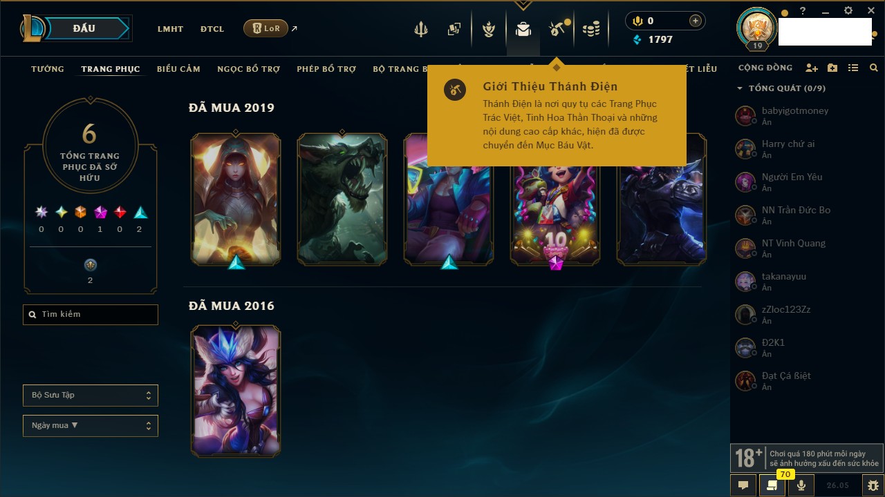 Rank Đơn: Chưa rank mùa nàoKhung: Chưa có khungTướng: 23 - Còn 7450 THXTrang Phục: 4Rank ĐTCL: Chưa RankLinh Thú: 24