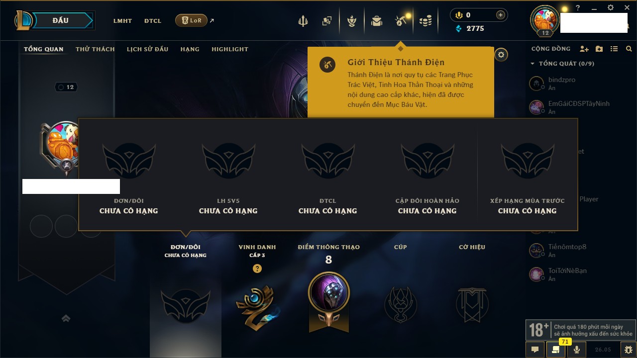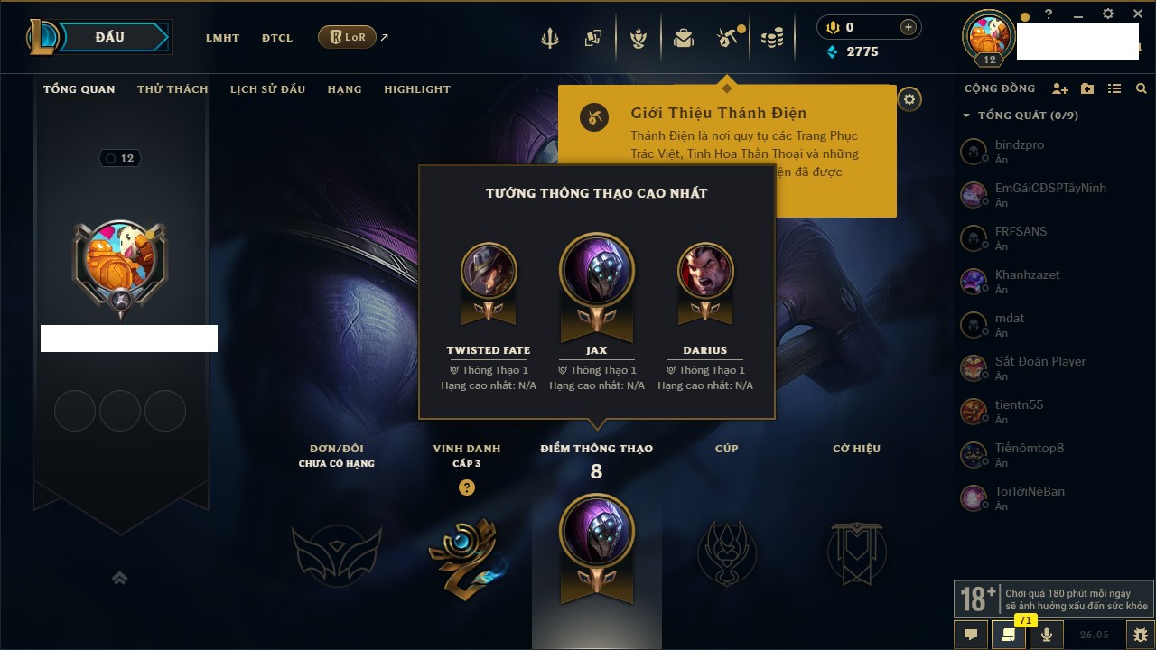 Rank Đơn: Chưa rank mùa nàoKhung: Chưa có khungTướng: 17 - Còn 1650 THXTrang Phục: 0Rank ĐTCL: Chưa RankLinh Thú: 8