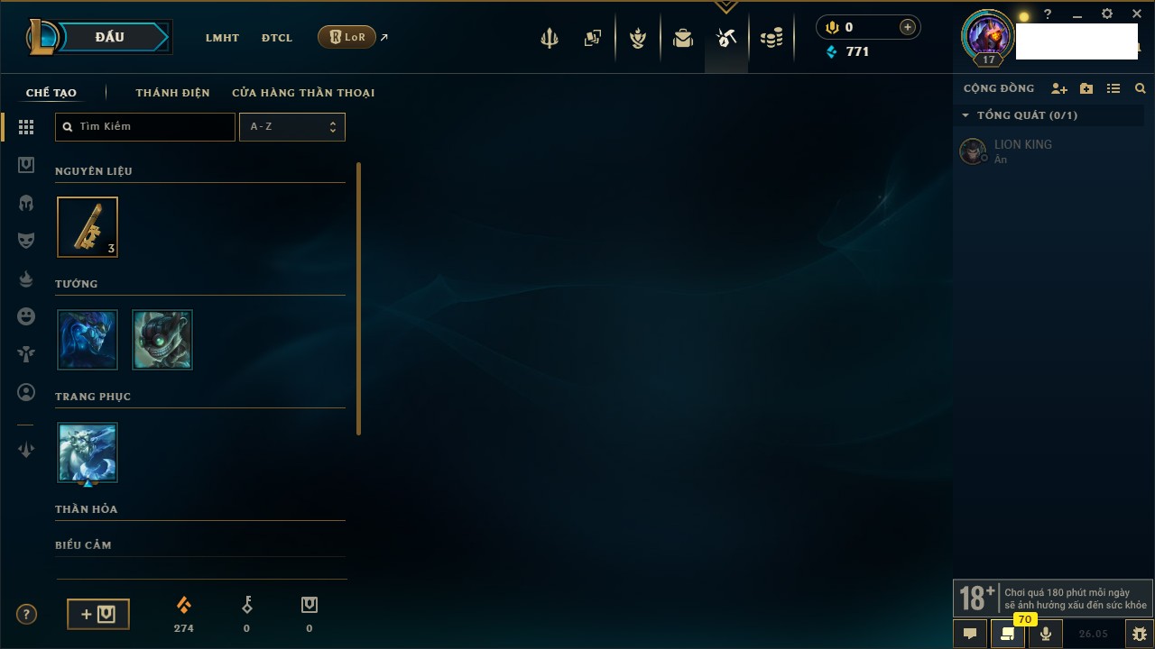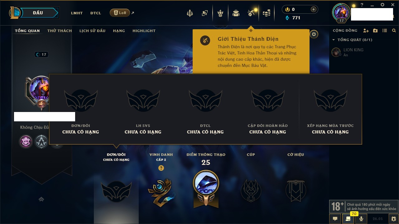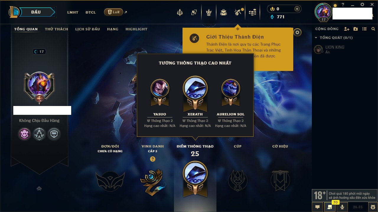 Rank Đơn: Chưa rank mùa nàoKhung: Chưa có khungTướng: 17 - Còn 1650 THXTrang Phục: 0Rank ĐTCL: Chưa RankLinh Thú: 8