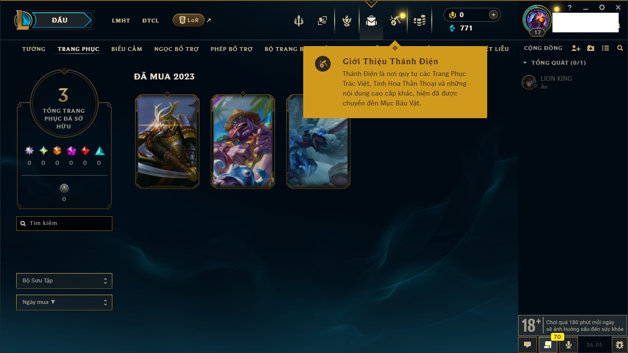 Rank Đơn: Chưa rank mùa nàoKhung: Chưa có khungTướng: 20 - Còn 4410 THXTrang Phục: 2Rank ĐTCL: Chưa RankLinh Thú: 2