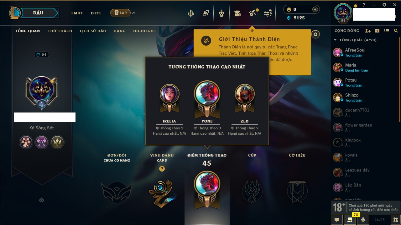 Rank Đơn: Chưa rank mùa nàoKhung: Chưa có khungTướng: 27 - Còn 2125 THXTrang Phục: 1Rank ĐTCL: Chưa RankLinh Thú: 22