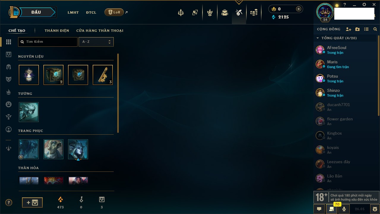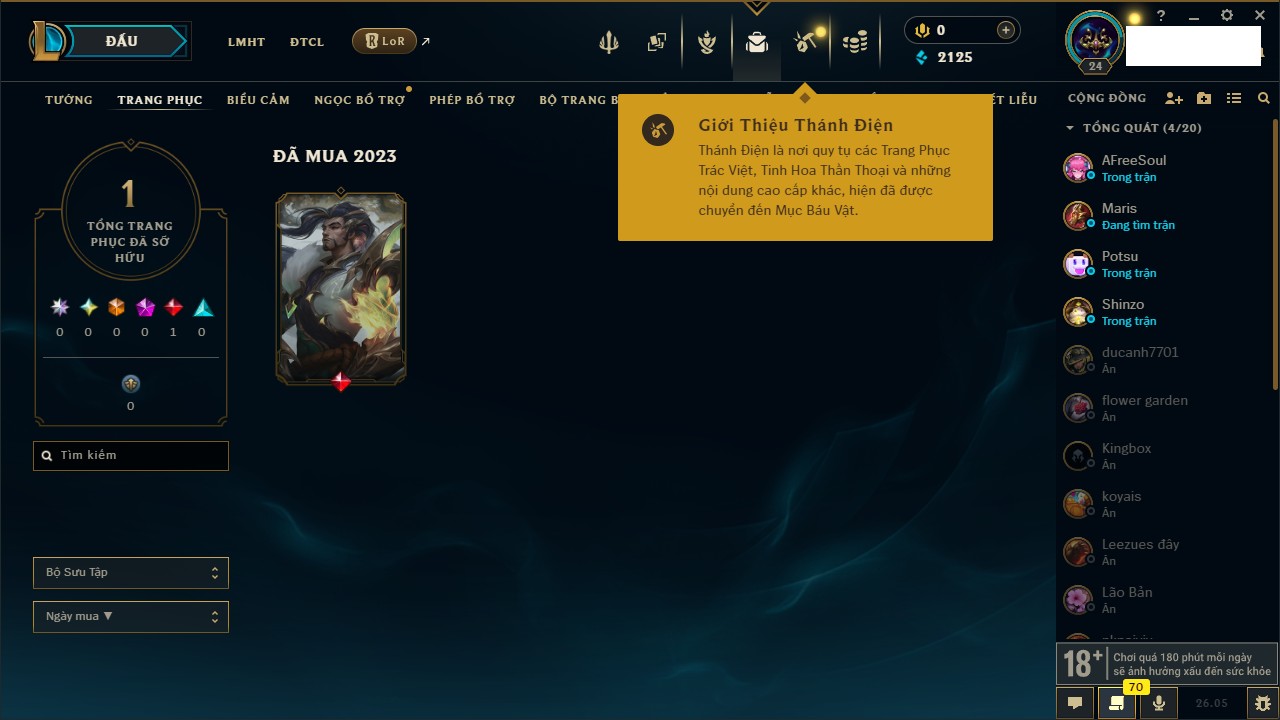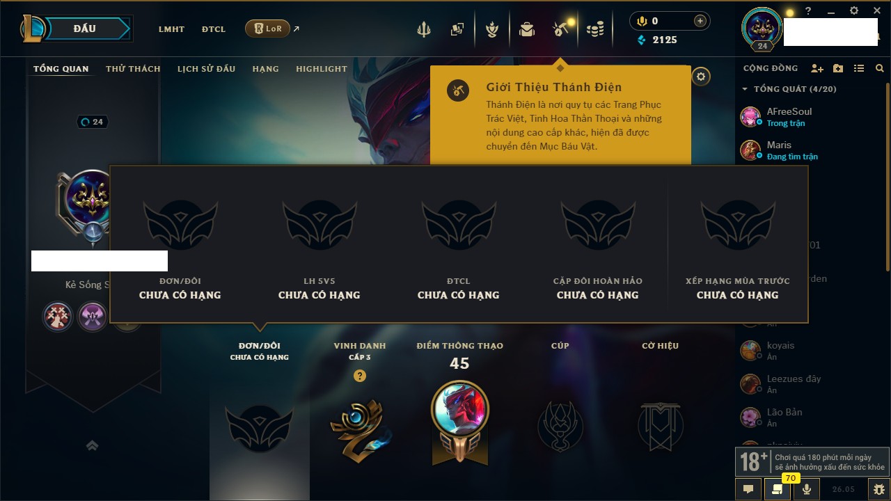 Rank Đơn: Chưa rank mùa nàoKhung: Chưa có khungTướng: 147 - Còn 12786 THXTrang Phục: 0Rank ĐTCL: Chưa RankLinh Thú: 22