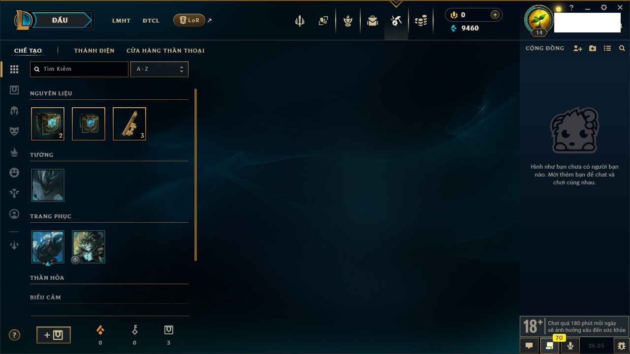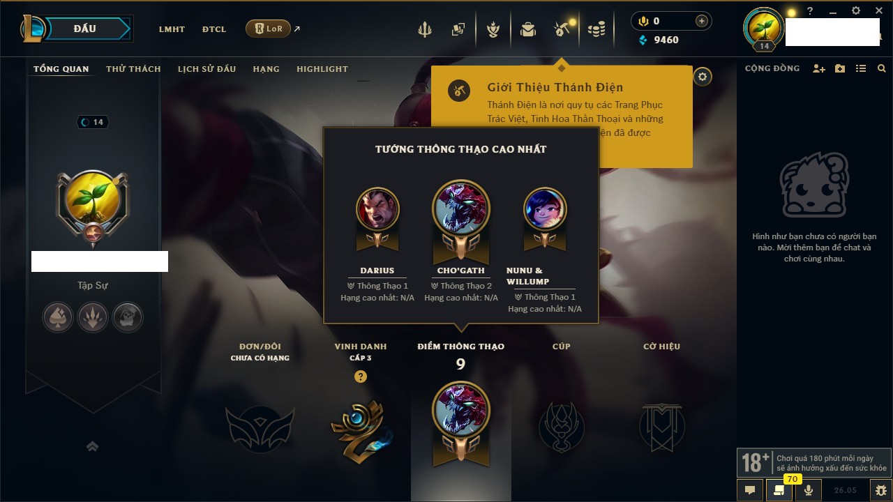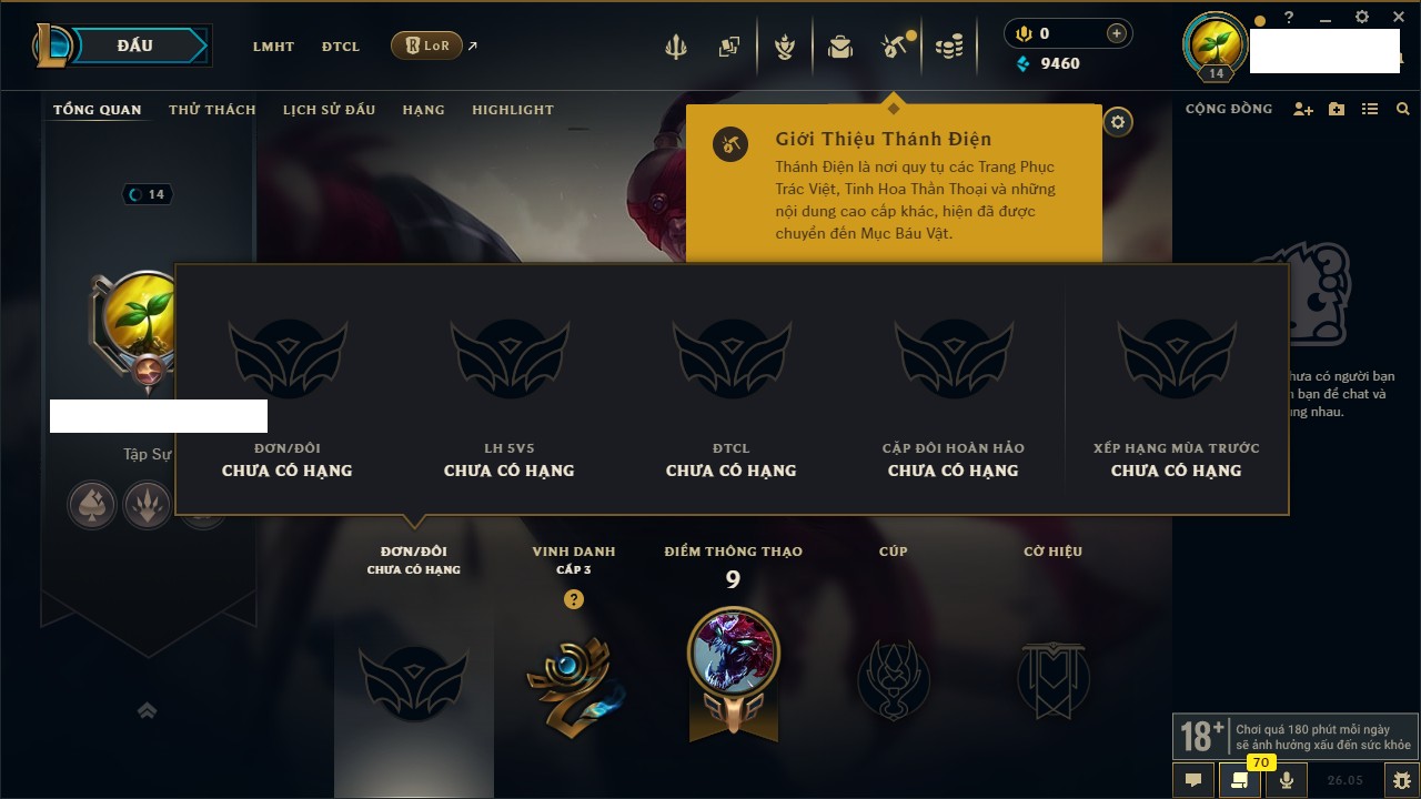 Rank Đơn: Chưa rank mùa nàoKhung: Chưa có khungTướng: 24 - Còn 9460 THXTrang Phục: 0Rank ĐTCL: Chưa RankLinh Thú: 5