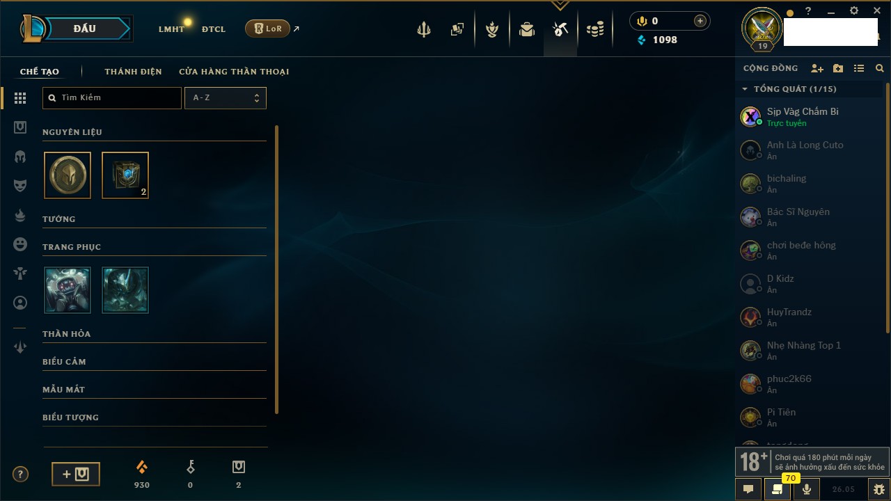 Rank Đơn: Chưa rank mùa nàoKhung: Chưa có khungTướng: 18 - Còn 1098 THXTrang Phục: 3Rank ĐTCL: Chưa RankLinh Thú: 13