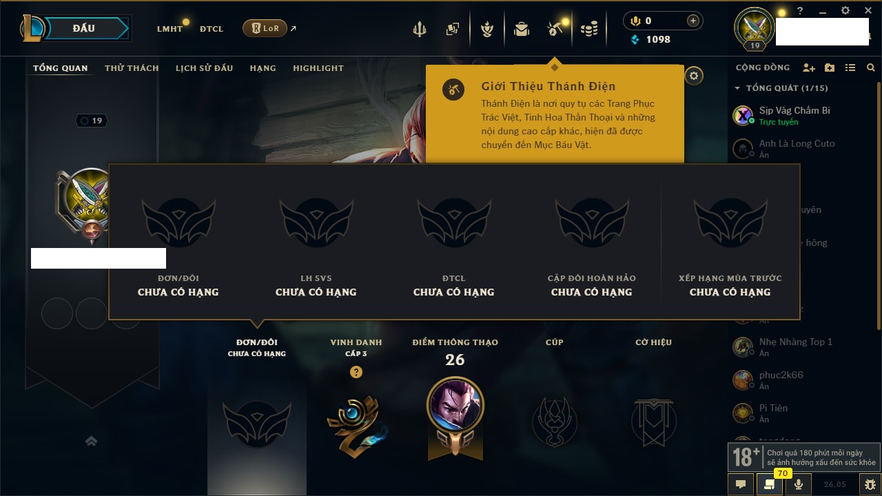 Rank Đơn: Chưa rank mùa nàoKhung: Chưa có khungTướng: 147 - Còn 12786 THXTrang Phục: 0Rank ĐTCL: Chưa RankLinh Thú: 22