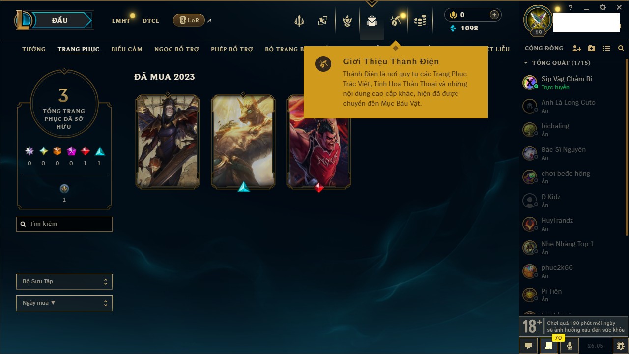 Rank Đơn: Chưa rank mùa nàoKhung: Chưa có khungTướng: 27 - Còn 2125 THXTrang Phục: 1Rank ĐTCL: Chưa RankLinh Thú: 22