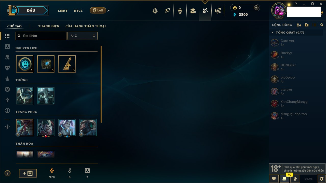 Rank Đơn: Chưa rank mùa nàoKhung: Chưa có khungTướng: 19 - Còn 410 THXTrang Phục: 0Rank ĐTCL: Chưa RankLinh Thú: 6
