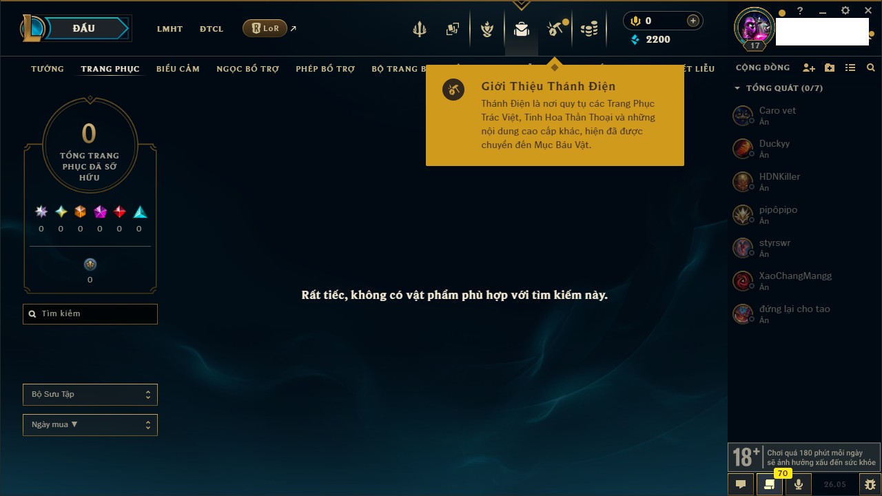 Rank Đơn: Chưa rank mùa nàoKhung: Chưa có khungTướng: 21 - Còn 115 THXTrang Phục: 0Rank ĐTCL: Chưa RankLinh Thú: 6