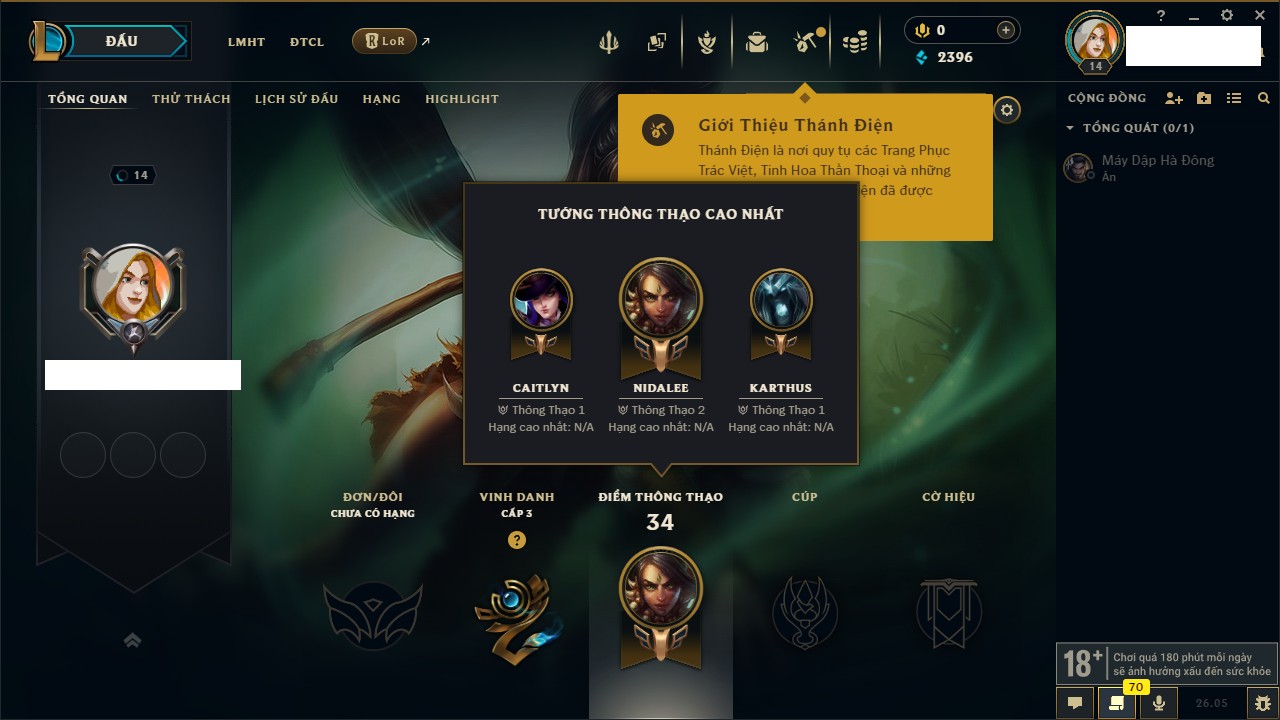Rank Đơn: Chưa rank mùa nàoKhung: Chưa có khungTướng: 20 - Còn 4410 THXTrang Phục: 2Rank ĐTCL: Chưa RankLinh Thú: 2