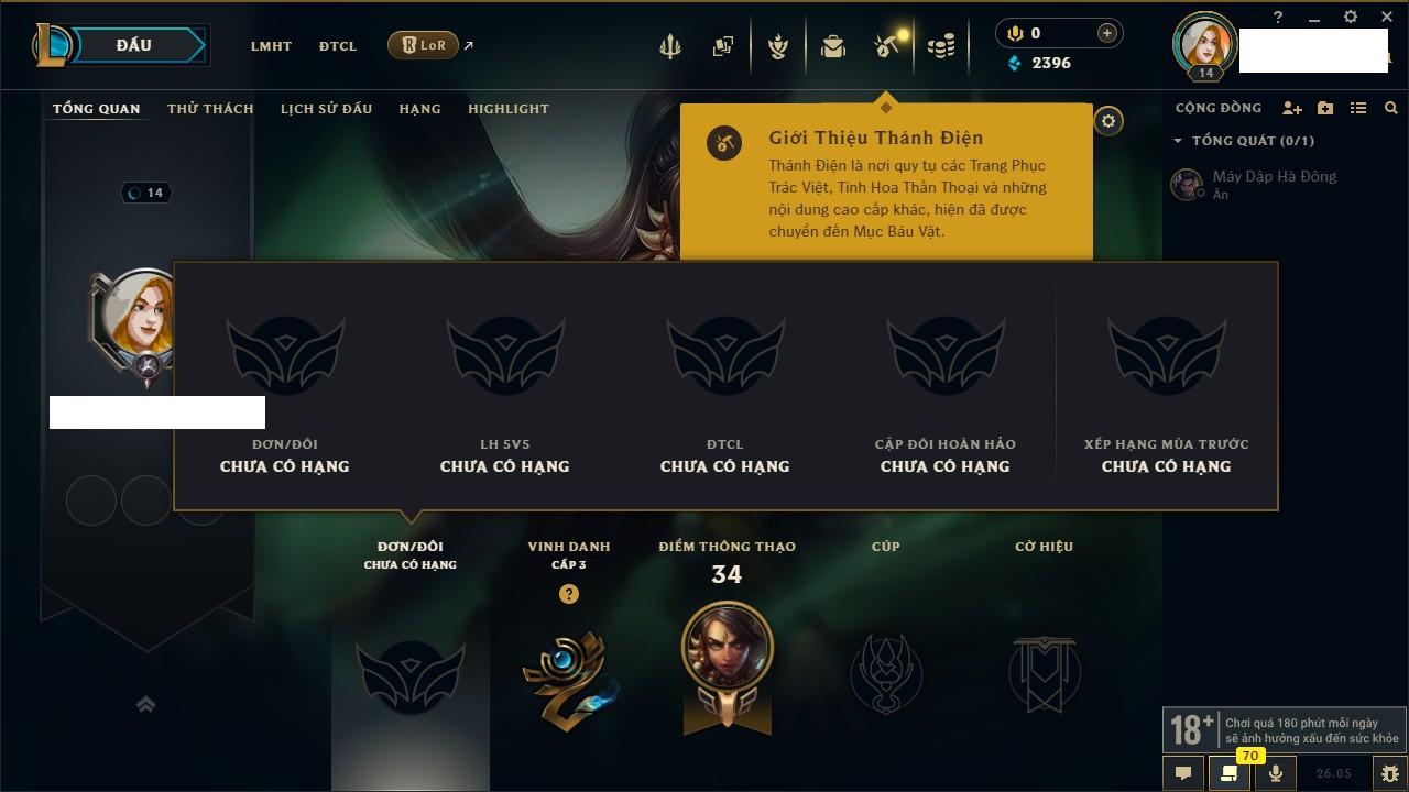Rank Đơn: Chưa rank mùa nàoKhung: Chưa có khungTướng: 20 - Còn 8195 THXTrang Phục: 2Rank ĐTCL: Chưa RankLinh Thú: 2