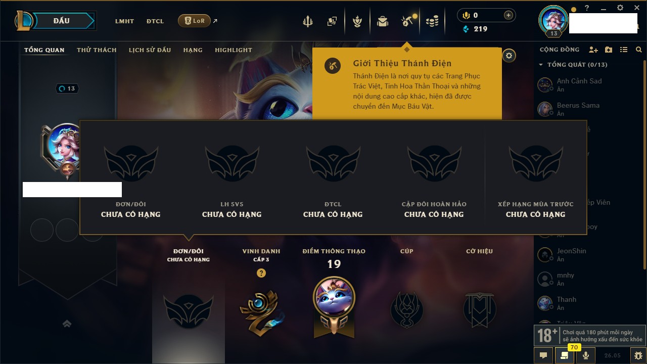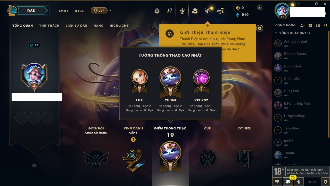 Rank Đơn: Chưa rank mùa nàoKhung: Chưa có khungTướng: 19 - Còn 410 THXTrang Phục: 0Rank ĐTCL: Chưa RankLinh Thú: 6