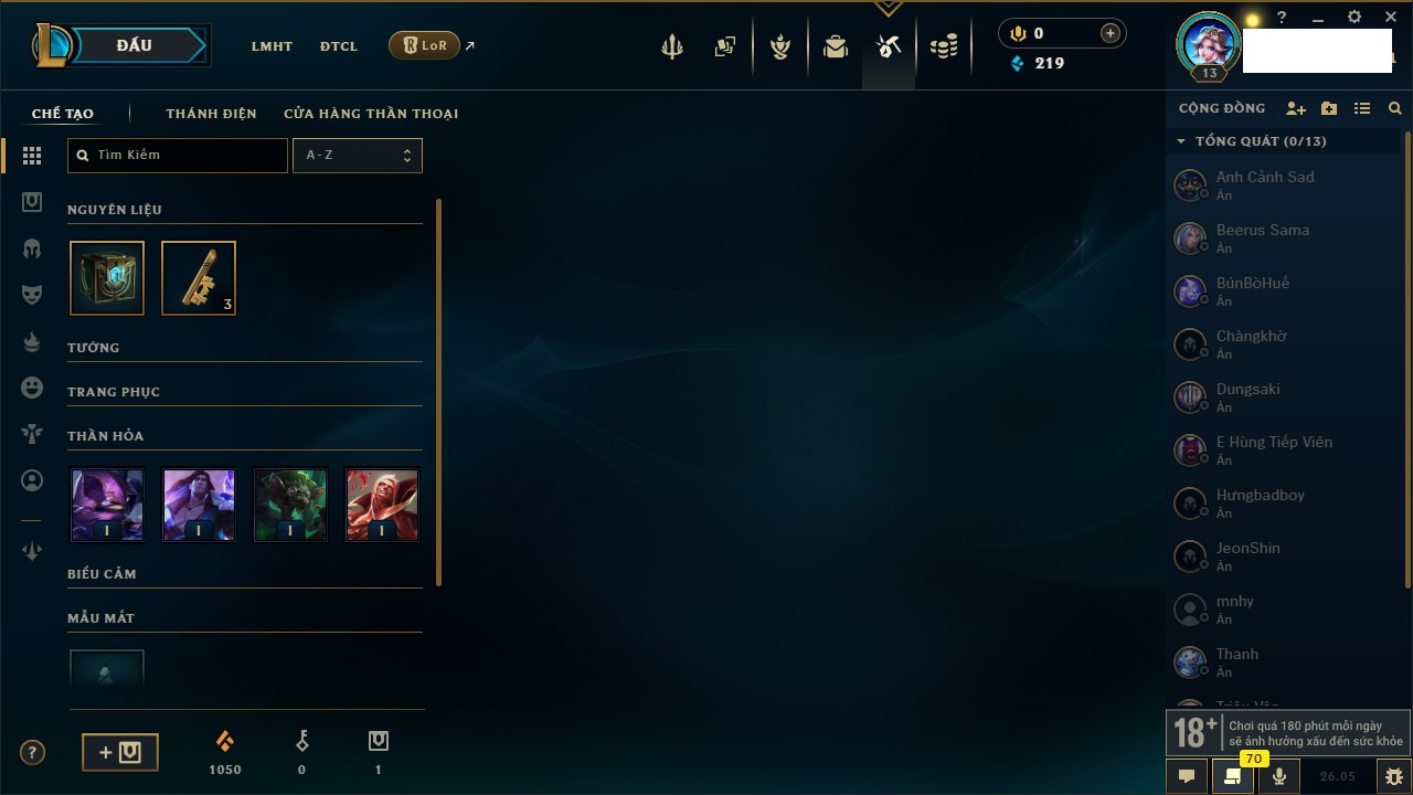 Rank Đơn: Chưa rank mùa nàoKhung: Chưa có khungTướng: 17 - Còn 1650 THXTrang Phục: 0Rank ĐTCL: Chưa RankLinh Thú: 8