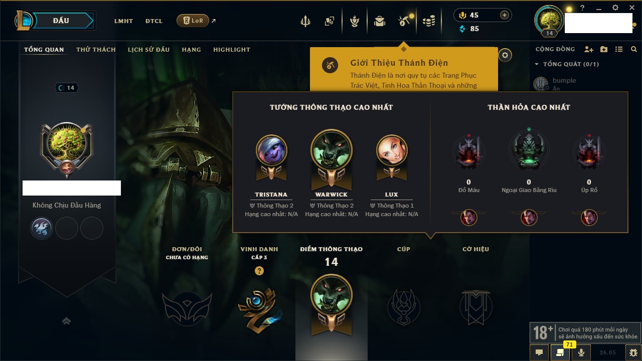 Rank Đơn: Chưa rank mùa nàoKhung: Chưa có khungTướng: 147 - Còn 12786 THXTrang Phục: 0Rank ĐTCL: Chưa RankLinh Thú: 22