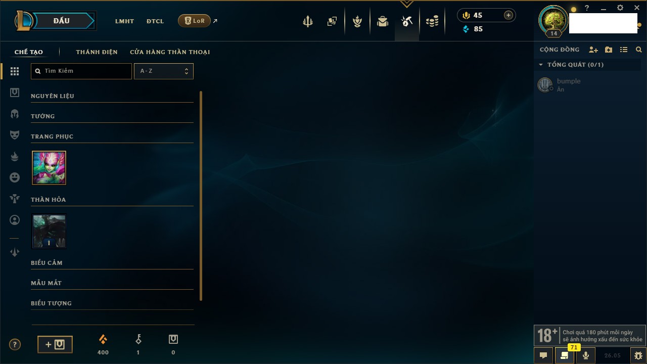 Rank Đơn: Chưa rank mùa nàoKhung: Chưa có khungTướng: 27 - Còn 2125 THXTrang Phục: 1Rank ĐTCL: Chưa RankLinh Thú: 22