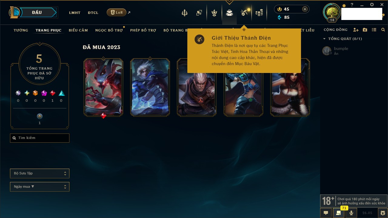 Rank Đơn: Chưa rank mùa nàoKhung: Chưa có khungTướng: 39 - Còn 85 THXTrang Phục: 5Rank ĐTCL: Chưa RankLinh Thú: 25