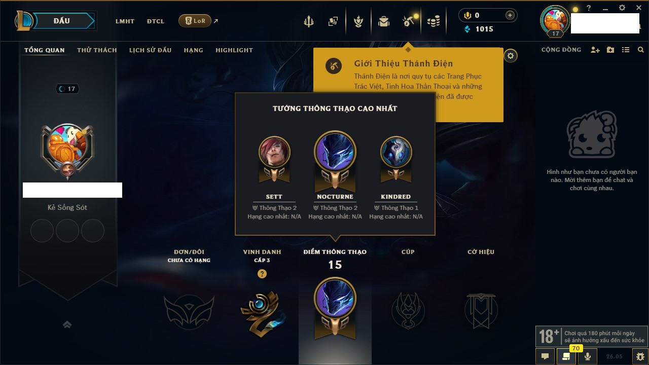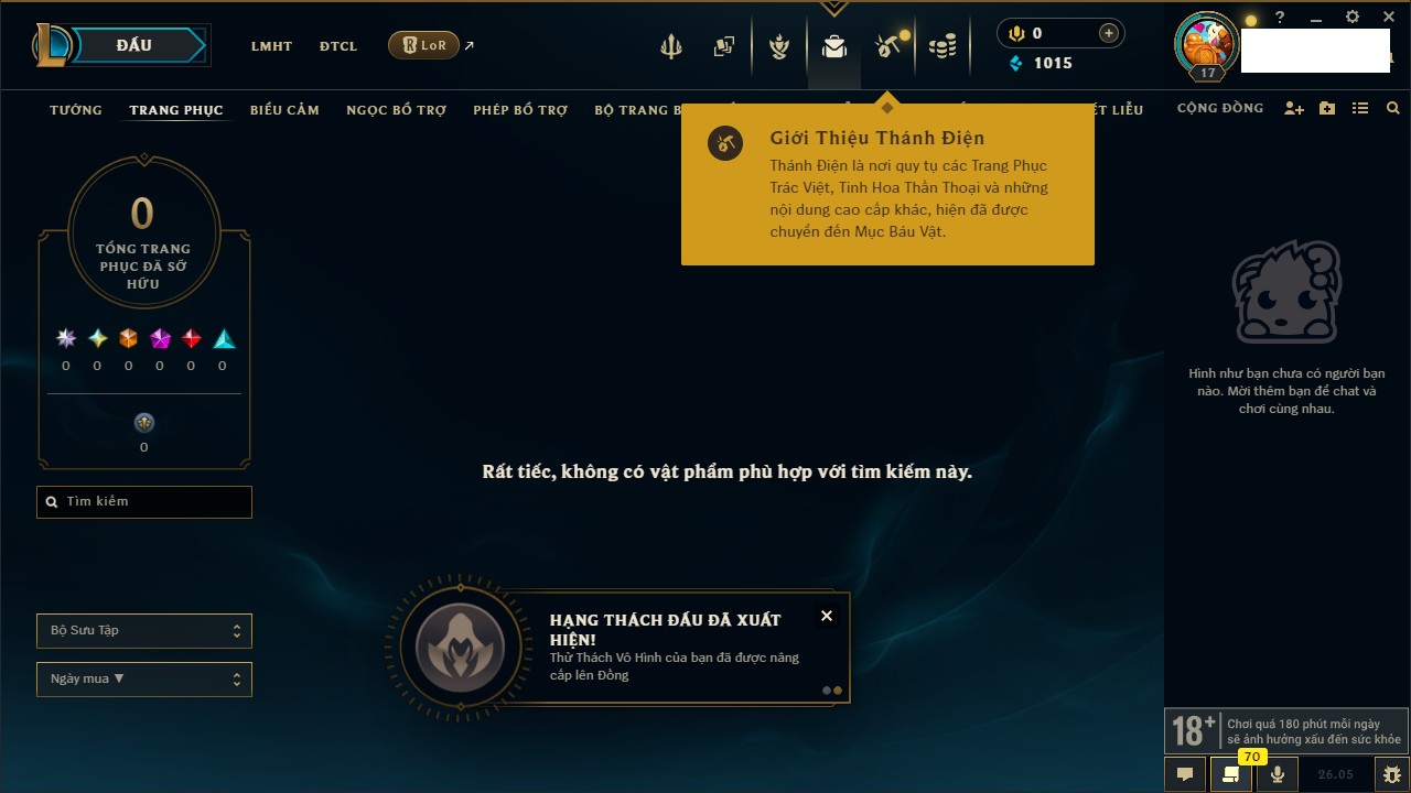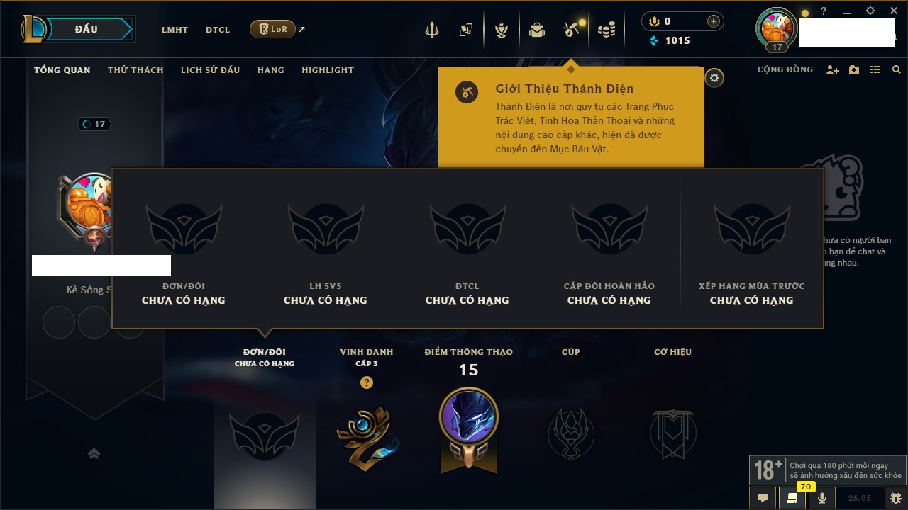 Rank Đơn: Chưa rank mùa nàoKhung: Chưa có khungTướng: 21 - Còn 115 THXTrang Phục: 0Rank ĐTCL: Chưa RankLinh Thú: 6