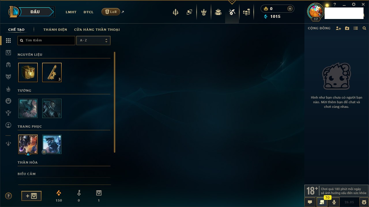 Rank Đơn: Chưa rank mùa nàoKhung: Chưa có khungTướng: 17 - Còn 1650 THXTrang Phục: 0Rank ĐTCL: Chưa RankLinh Thú: 8