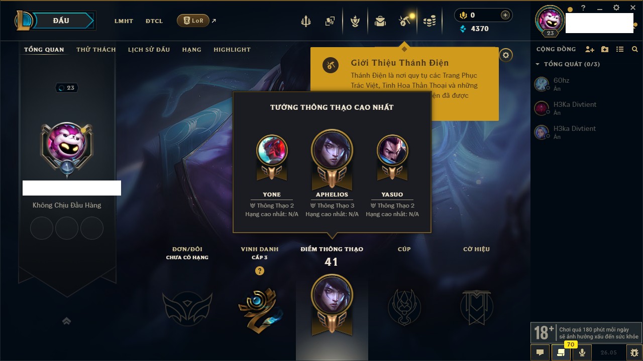 Rank Đơn: Chưa rank mùa nàoKhung: Chưa có khungTướng: 23 - Còn 8625 THXTrang Phục: 0Rank ĐTCL: Chưa RankLinh Thú: 13