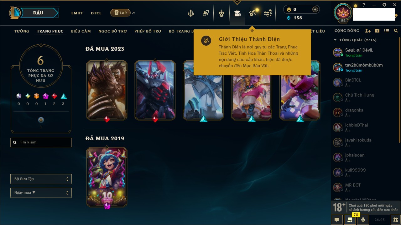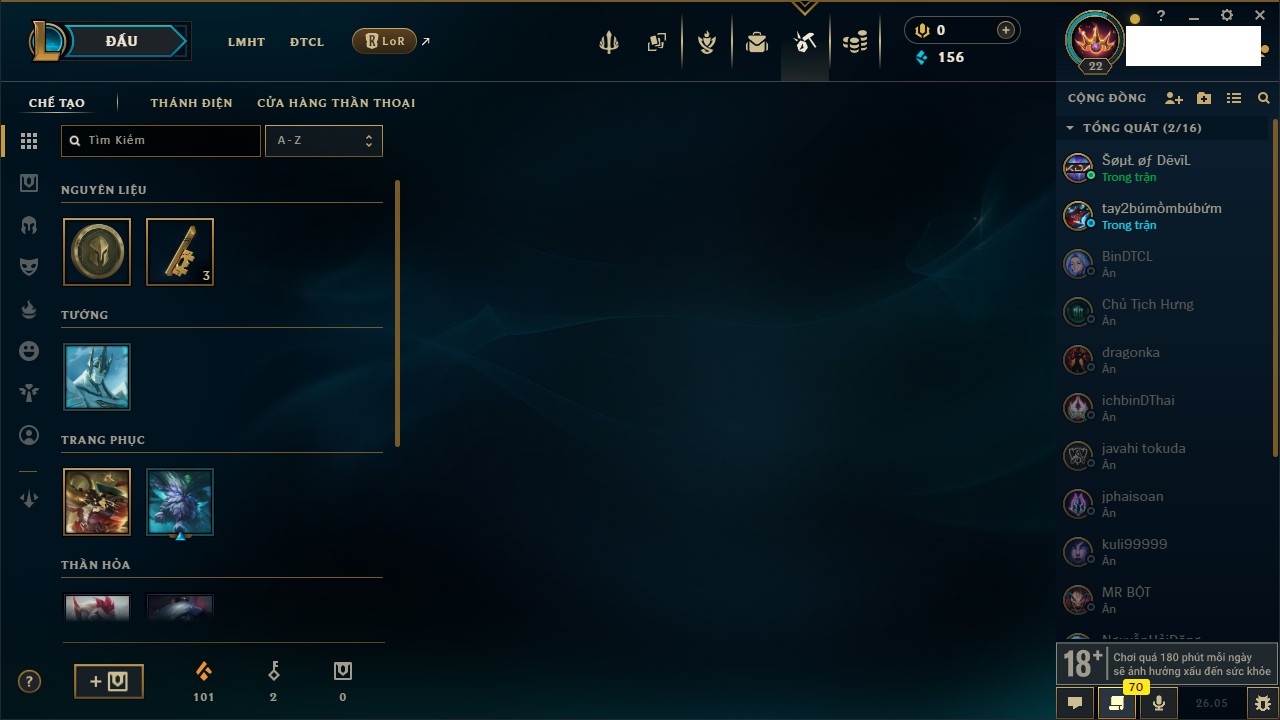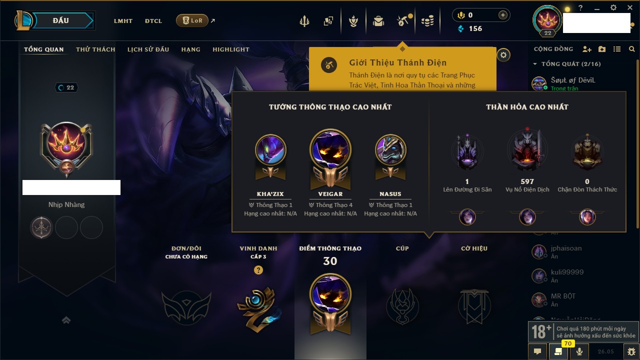 Rank Đơn: Chưa rank mùa nàoKhung: Chưa có khungTướng: 27 - Còn 2125 THXTrang Phục: 1Rank ĐTCL: Chưa RankLinh Thú: 22