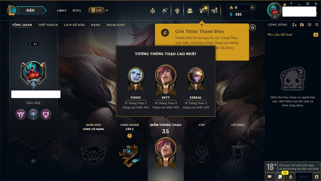 Rank Đơn: Chưa rank mùa nàoKhung: Chưa có khungTướng: 30 - Còn 2985 THXTrang Phục: 0Rank ĐTCL: Chưa RankLinh Thú: 10