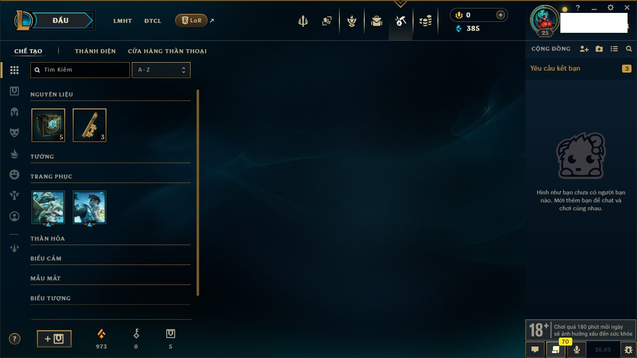 Rank Đơn: Chưa rank mùa nàoKhung: Chưa có khungTướng: 21 - Còn 90 THXTrang Phục: 0Rank ĐTCL: Chưa RankLinh Thú: 7
