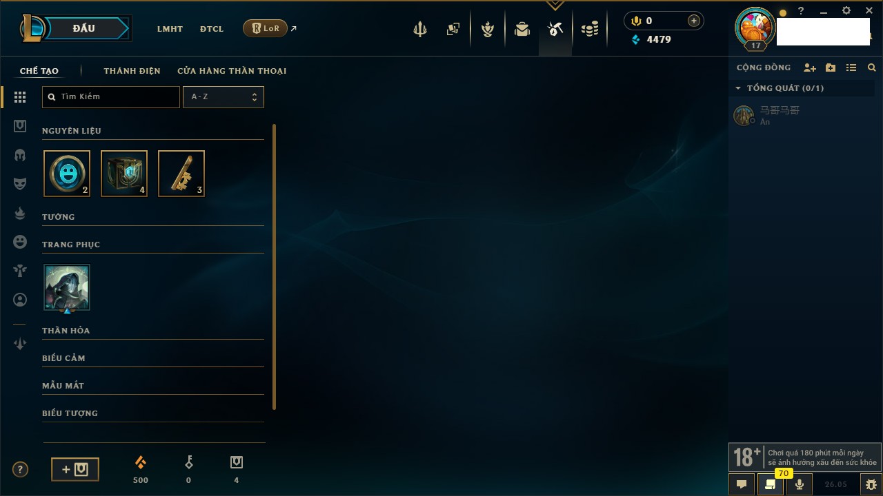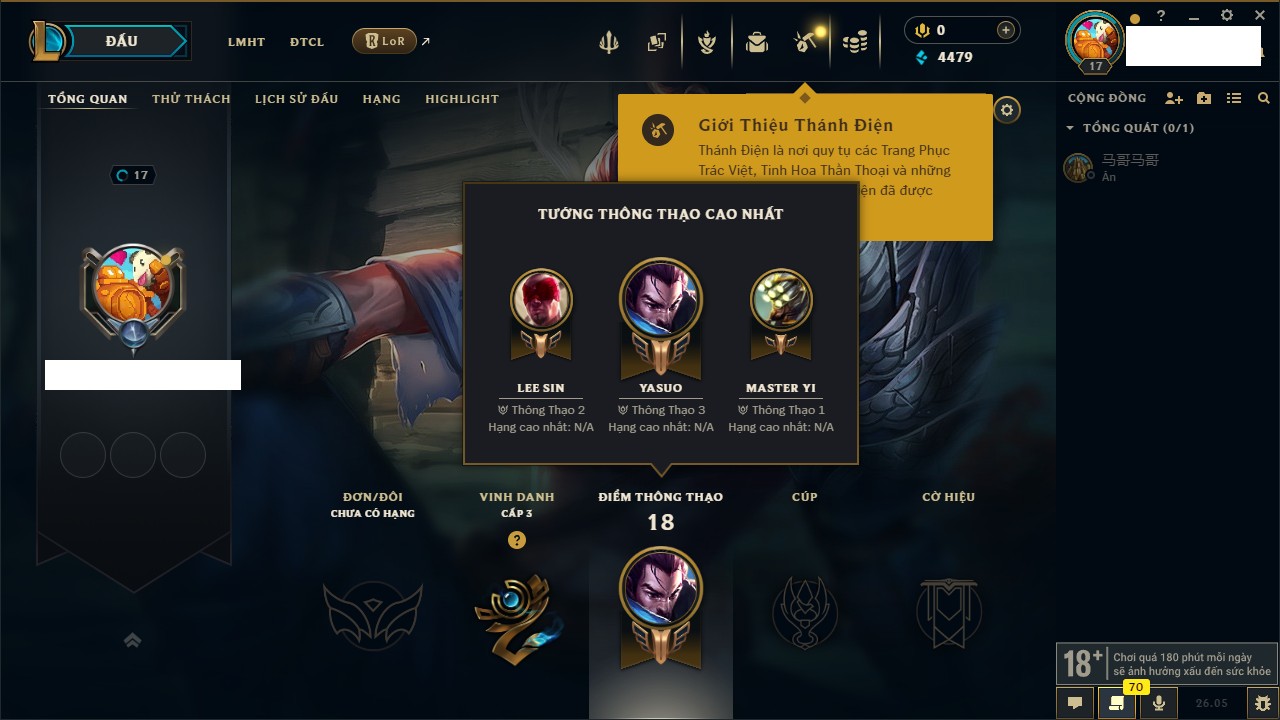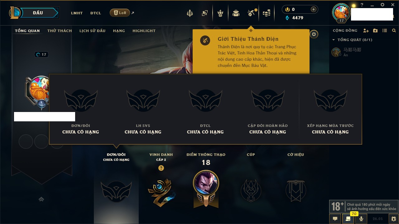 Rank Đơn: Chưa rank mùa nàoKhung: Chưa có khungTướng: 22 - Còn 1444 THXTrang Phục: 0Rank ĐTCL: Chưa RankLinh Thú: 8