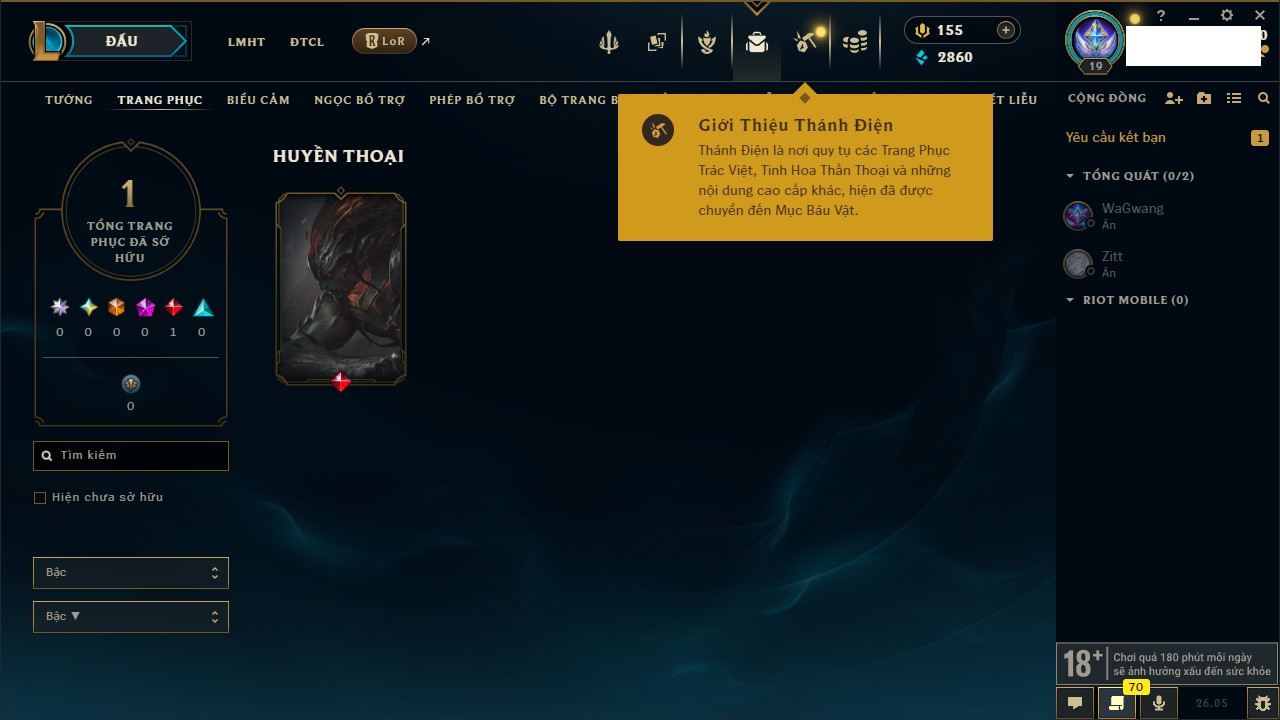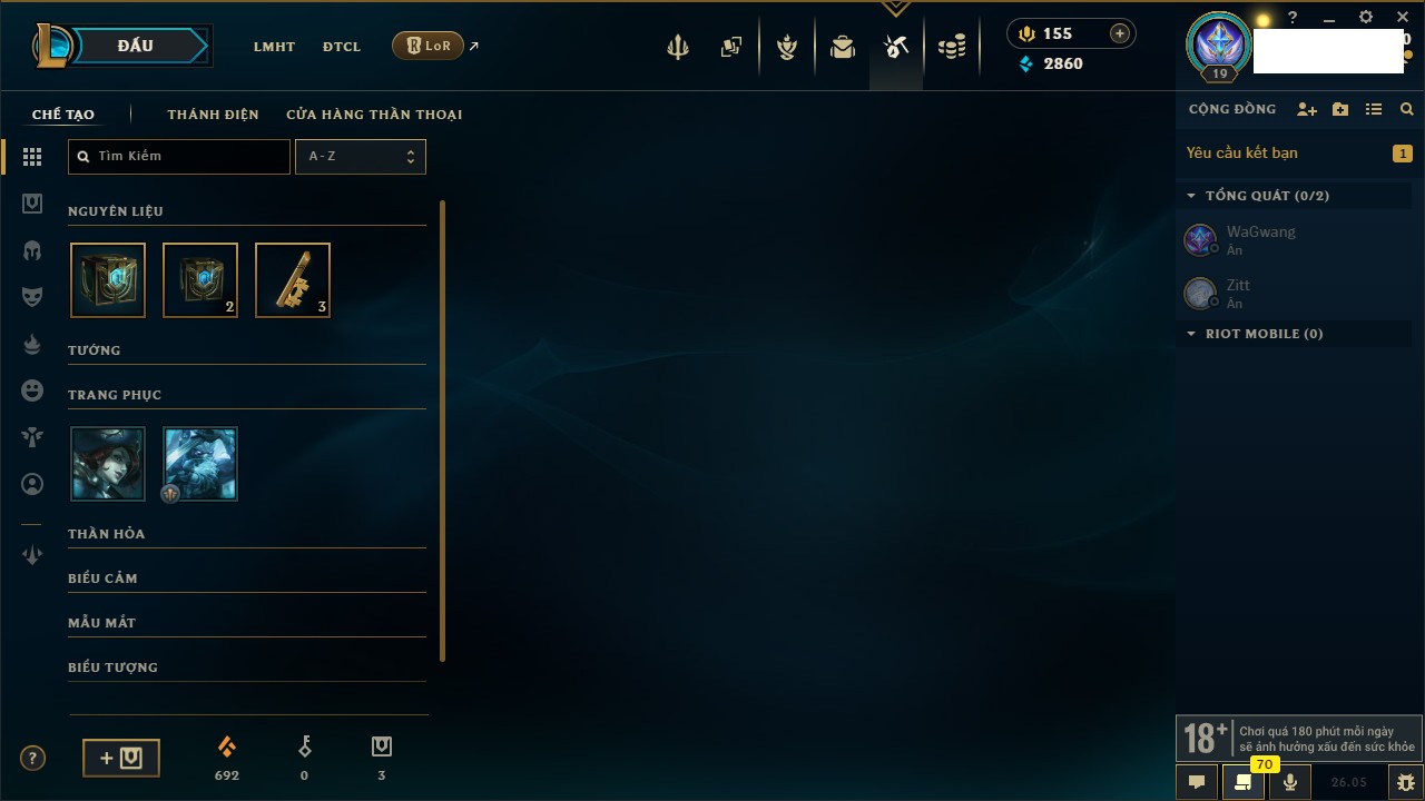 Rank Đơn: Chưa rank mùa nàoKhung: Chưa có khungTướng: 22 - Còn 1444 THXTrang Phục: 0Rank ĐTCL: Chưa RankLinh Thú: 8