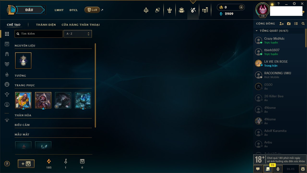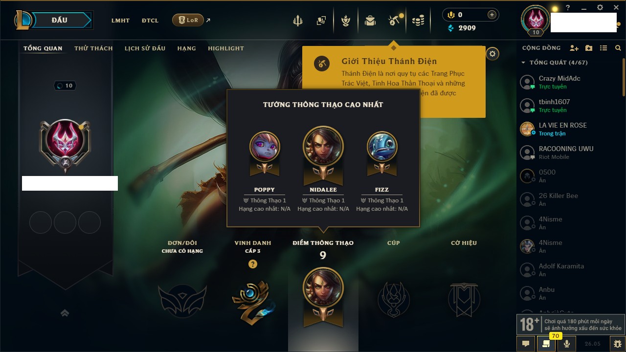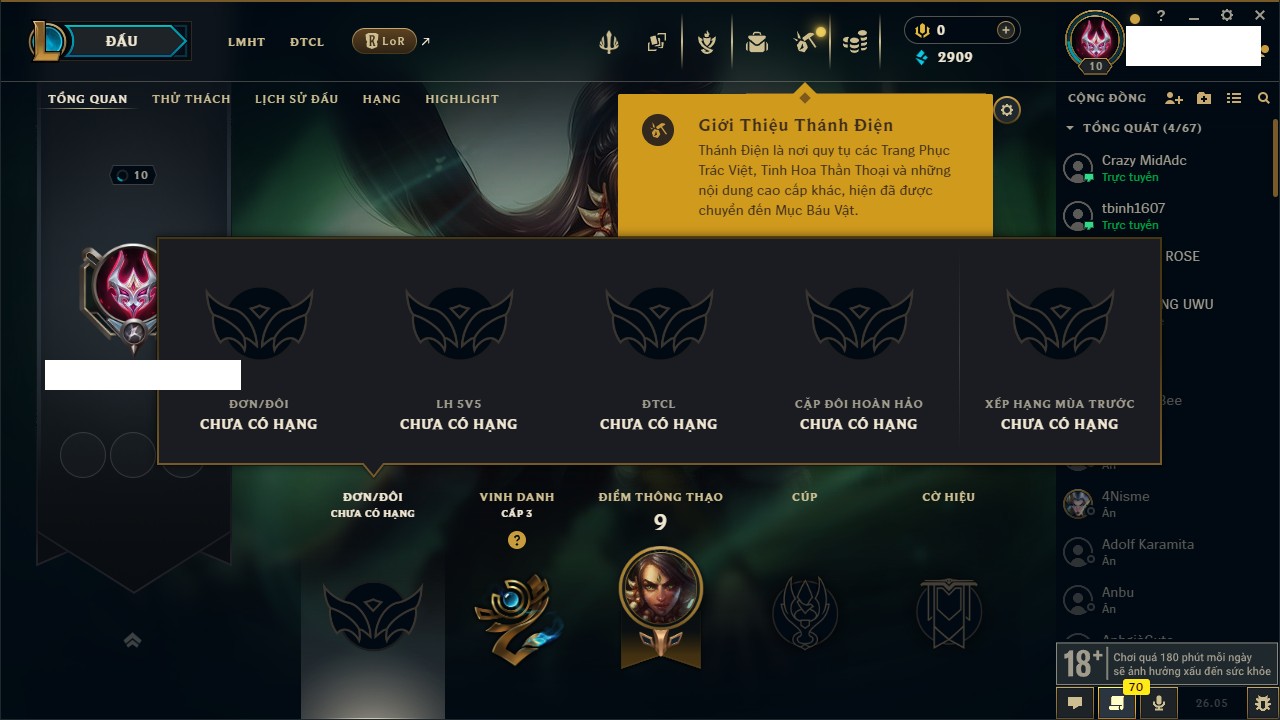 Rank Đơn: Chưa rank mùa nàoKhung: Chưa có khungTướng: 21 - Còn 90 THXTrang Phục: 0Rank ĐTCL: Chưa RankLinh Thú: 7